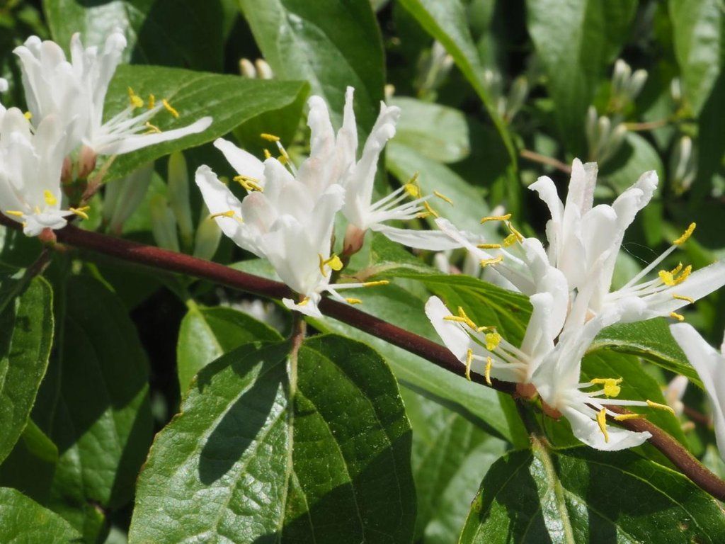 Geißblatt Maackii - ein laubabwerfender Strauch aus Ostasien. Dieser Strauch gehört zur Familie der Caprifoliaceae und ist bekannt für seine Widerstandsfähigkeit, sein schnelles Wachstum und sein ausgeprägtes grünes Laub. Er erreicht eine Höhe von etwa 3-6 m, hat eine dichte Krone mit überhängenden Ästen und ovale, längliche Blätter, die meist wechselständig an den Stielen stehen und im Sommer eine dunkelgrüne Farbe haben. Die Blüten sind klein, cremeweiß und duftend. Sie blühen vom späten Frühling bis zum frühen Sommer und sind in endständigen Trauben angeordnet und für Bestäuber wie Bienen und Schmetterlinge attraktiv. Nach der Blüte erscheinen rote oder orange Beeren, die eine beliebte Nahrung für Vögel sind. Das Maackii-Geißblatt ist bekannt für seine Fähigkeit, schnell zu wachsen und sich leicht durch Samen und Wurzelausläufer zu verbreiten.