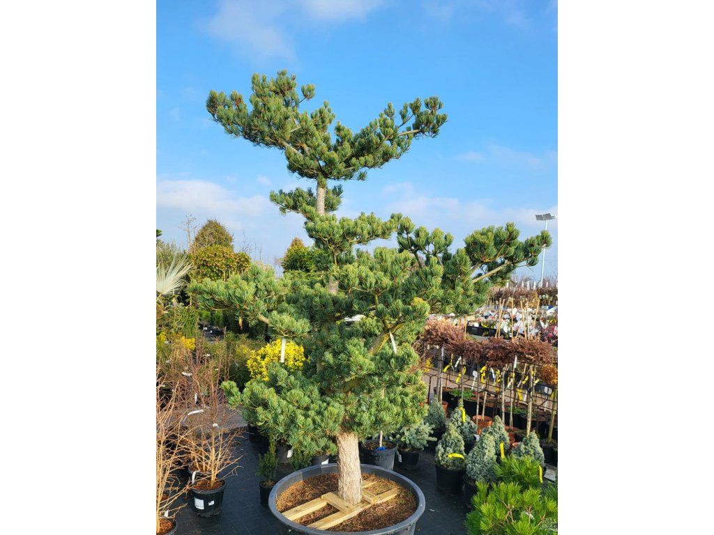 Japanische Mädchenkiefer - Pinus parviflora ist eine außergewöhnlich schöne, zarte Kiefer aus Japan. Sie ist kleiner im Wuchs, mit kürzeren Nadeln. In Japan ist sie unter dem Namen Goyomatsu bekannt und sehr beliebt als Objekt für die Kultivierung berühmter Bonsai. Ein zart wirkender, 10-20 m hoher Baum. Die Krone ist breit kegelförmig, mit einer lange glatt bleibenden, schwarz-grauen, später schuppigen Rinde. Die Äste sind breit ausgebreitet, die Triebe grünlichbraun, kurz behaart. Die Knospen sind klein, eiförmig, verjüngt, braun-gelb. Sie fruchtet früh, die Zapfen wachsen einzeln und in Gruppen, horizontal abstehend und sitzend, länglich, 5-10 × 3-4 cm. Die Nadeln wachsen in Fünferbüscheln, an den Zweigspitzen buschig gehäuft, 3-8 cm lang, mit weißen Spaltöffnungsreihen, zart und gebogen. Das ursprüngliche Verbreitungsgebiet ist in den Bergregionen Japans (Honshu und Hokkaido) und Südkoreas. Diese Art ist sehr variabel und kommt in den Bergen (1500-2500 m ü. d. M.) vor. Sie ist frostbeständig und anspruchslos an den Boden, benötigt jedoch mehr Niederschlag oder Bewässerung. Sie wächst sehr langsam und verträgt auch teilweisen Schatten. Ihr Hauptnutzen liegt in Zierpflanzungen als Parkgehölz und, wie bereits erwähnt, wird sie für Bonsais verwendet.