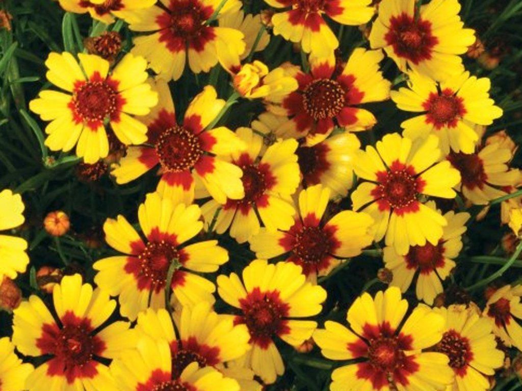 Coreopsis 'Pineapple Pie' - eine niedrige, farbenfrohe Staude. Die Blüten bestehen aus Blütenblättern, die leuchtend gelb sind und zur Mitte hin rot werden. Die Blätter sind zart und klein. Blüht von Juni bis September. Wächst bis zu 20 cm hoch. Sie kann im Topf oder als Teil eines Staudenbeetes kultiviert werden. Sieht in Bauerngärten sehr schön aus.