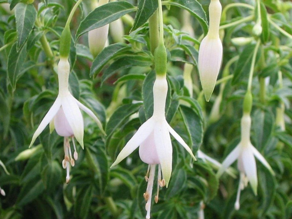 Fuchsie magellonská var. molinae - botanische Form der südamerikanischen Fuchsie, ursprünglich aus Patagonien, wo sie an Quellen, im Unterholz und an den Rändern von Bergwäldern wächst. Sie gehört zu den widerstandsfähigsten Vertretern der Gattung Fuchsia und zeichnet sich durch einen zarten, luftigen Habitus aus. Sie bildet einen teilweise verholzenden Strauch mit schmalen, lanzettlichen, mittelgrünen Blättern, die den pastelligen Charakter der Blüten unterstreichen. Die Blüten sind klein, lang überhängend und bestehen aus einem hellrosa Kelch und einem hellvioletten Kronenteil. Sie erscheinen von Juni bis Oktober in regelmäßigem Rhythmus, was eine lange dekorative Wirkung gewährleistet. Einzelne Blüten messen 2 bis 3 cm. Der Strauch erreicht eine Höhe von 1 bis 1,2 m und eine Breite von 0,7 bis 1 m. Die Früchte sind kleine blau-schwarze Beeren mit einem leicht süßlichen Geschmack. Im Garten wird er als blühender Strauch für halbschattige Bereiche eingesetzt, geeignet zwischen Stauden, für natürliche Pflanzungen und größere Behälter. Mit seiner zarten Färbung wirkt er leichter als übliche rot-violette Formen und kontrastiert gut mit dunkelblättrigen Sträuchern oder schattenliebenden Stauden.