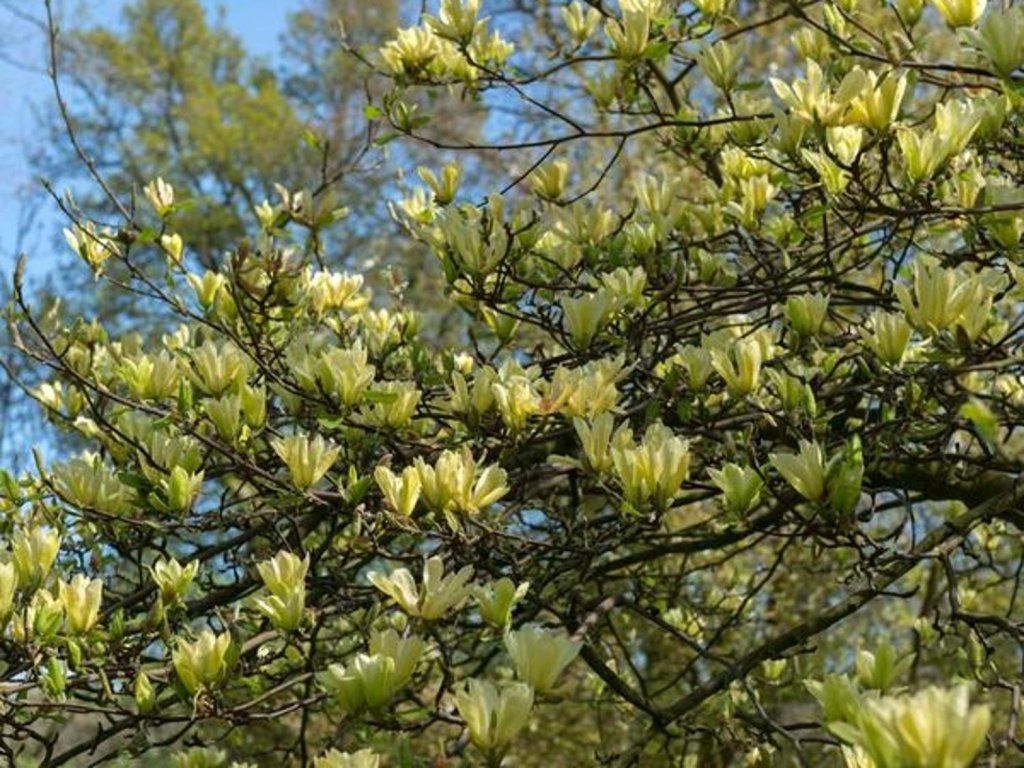 Magnolie 'Butterflies' - ein eleganter, laubabwerfender Strauch, der sich durch auffällige gelbe Blüten und ein attraktives Wachstum auszeichnet. Mit einer Höhe von 3-4 m und einer mäßig breiten Kronenbreite von 2-3 m bietet er einen ansprechenden Anblick für jeden Garten. Die Blüten sind halbgefüllt mit 9-12 Blütenblättern und haben einen angenehmen Gelbton mit einem leichten grünlichen Schimmer auf der Unterseite des äußeren Kelchs. Sie sind nicht nur durch ihre Farbe attraktiv, sondern auch durch ihre Anordnung, was den Eindruck erweckt, als hätte sich ein Schwarm von Zitronenfaltern auf den Ästen niedergelassen, um die Frühlingssonne zu genießen. Die Mitte der Blüte ist auffällig mit roten Staubgefäßen verziert, was der Blüte eine zusätzliche Schicht an Kontrast und Attraktivität verleiht. Sie blüht mittelspät, was es ermöglicht, späte Frühlingsfröste zu vermeiden. Die Blütenstände erscheinen noch vor dem Laubaustrieb und bieten einen außergewöhnlichen Anblick zu Beginn der Vegetationsperiode. Diese Sorte ist eine Kreuzung zwischen Magnolie denudata und Magnolie acuminata, gezüchtet 1988 in Michigan, USA, von Phil Savage. Die Magnolie 'Butterflies' ist nicht nur eine blumige Zierde, sondern auch ein einzigartiger Beitrag zur gesamten Ästhetik des Gartens.