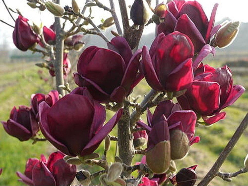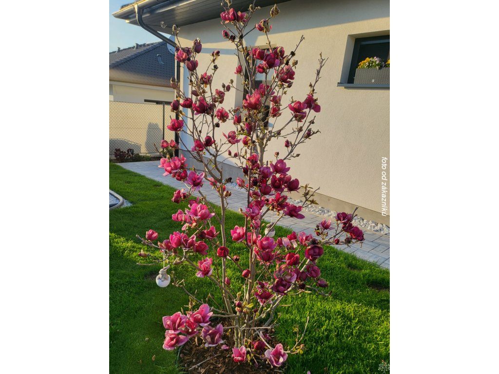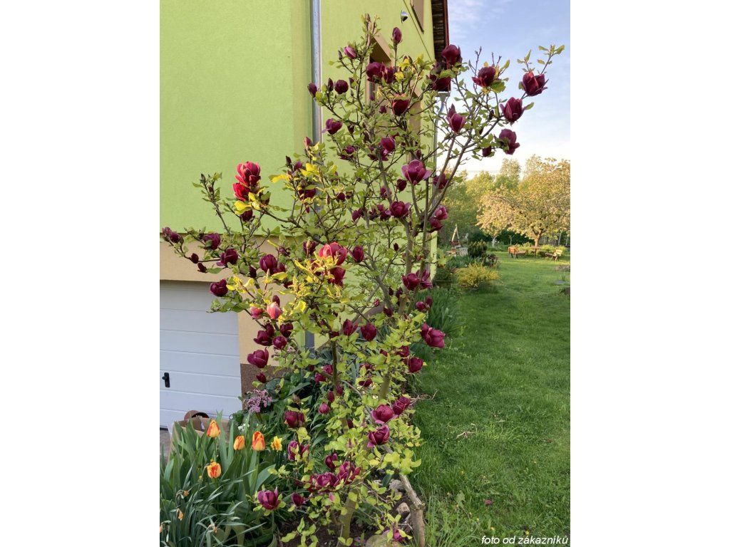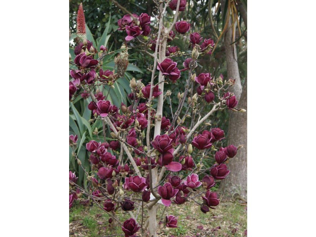 Magnolie 'Genie' – ist das Ergebnis fünfzehnjähriger, präziser Arbeit des neuseeländischen Züchters Vance Hooper, der sich zum Ziel gesetzt hatte, eine Magnolie mit der stabilsten roten Farbe auf dem Markt zu schaffen. Diese Hybridform entstand durch eine komplexe Kreuzung der Linien Magnolia soulangeana und Magnolia liliiflora, wobei Widerstandsfähigkeit und Kompaktheit in die genetische Ausstattung eingebracht wurden. Der Strauch wächst langsam und bildet eine dichte, pyramidenförmige bis eiförmige Wuchsform. Im Erwachsenenalter, nach mehr als zehn Jahren, erreicht er eine Höhe von 3 bis 4 Metern und eine Breite von etwa 1,5 bis 2 Metern. Dank dieser Abmessungen ist er die ideale Wahl für kleine Stadtgärten, Atrien oder japanische Ecken, wo er als unübersehbarer Solitär wirkt. Die Blüten sind ein wahres Meisterwerk der Natur. Die Knospen haben die Farbe schwarzer Johannisbeeren und sind von behaarten Hüllen geschützt. Nach dem Öffnen entfalten sich Blüten mit einem Durchmesser von 10 bis 15 cm, die die Form einer perfekten Tulpen- oder Lotosblüte haben. Sie bestehen aus 6 bis 12 steifen Blütenblättern, deren Farbe tiefweinrot bis rubinrot ist. Eine einzigartige Eigenschaft der Sorte 'Genie'® ist, dass diese Farbe auch nach dem Aufblühen konstant und satt bleibt, während bei anderen Sorten die Blüteninnenseite oft zu einem blassen Weiß verblasst. Die Hauptblütezeit findet im April und Mai statt. Die Pflanze hat eine starke Neigung zur Nachblüte, so dass sie bei guten Bedingungen im Sommer, normalerweise im August, wieder blüht, wenn die dunklen Blüten wunderschön mit den ledrigen, dunkelgrünen Blättern kontrastieren. Das Laub ist gesund und färbt sich im Herbst bronzefarben.