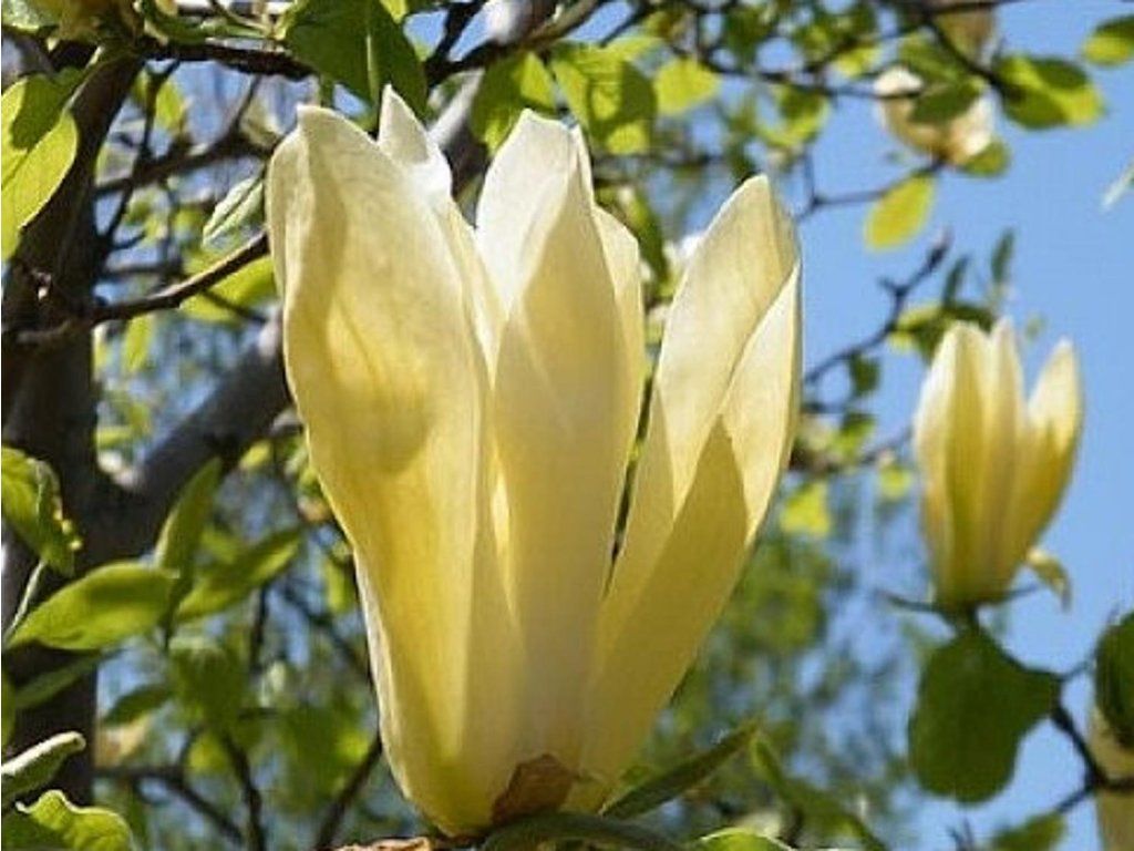 Magnolie 'Limelight' - eine Ziersorte der laubabwerfenden Magnolie, die dank ihrer auffälligen Blüten und ihres symmetrischen Wuchses ein markantes visuelles Element im Frühjahr bildet. Diese Sorte hat eine breite Krone und erreicht eine Höhe von etwa 4 – 6 Metern, was sie zu einer guten Wahl für mittelgroße Gärten macht. Die Blätter sind mittelgrün und erscheinen gleichzeitig oder kurz nach der Blüte, sie sind laubabwerfend. Die Hauptattraktion sind die Blüten, die sich normalerweise von April bis Anfang Mai öffnen, eine cremefarbene bis zitronengelbe Farbe mit einem zarten Duft haben und eine für Magnolien typische tulpenförmige Gestalt aufweisen. Das Wachstum ist mittelschnell mit großen Zuwächsen in den ersten Jahren. Sie gedeiht hervorragend in Gärten mit gut durchlässigem Boden und einem sonnigen bis halbschattigen Standort und eignet sich als dominanter Solitär oder in Kombination mit anderen Gehölzen, wo ihre farbenprächtigen Blüten die Frühlingsbepflanzung ergänzen.