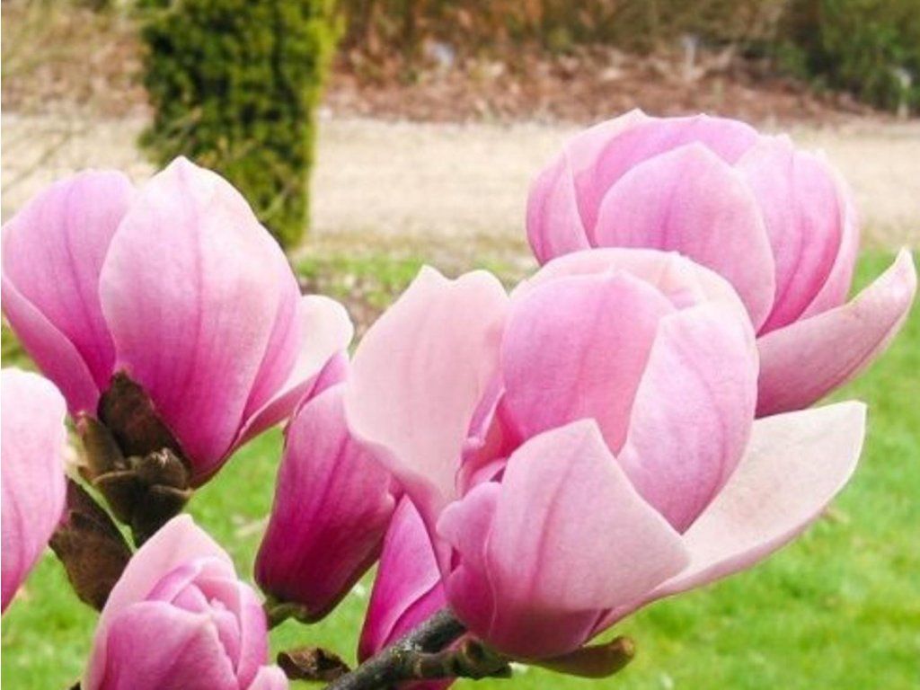 Anbau: Magnolien pflanzt man an sonnigen Standorten, die auch leichten Halbschatten vertragen und möglichst vor starkem Wind geschützt sein sollten. Der Boden sollte nährstoffreich und feucht, aber gut durchlässig sein, mit Zugabe von Torf (ideal ist eine Mischung aus Kompost, Torf und Sand). Wir halten die Magnolie gut gemulcht, damit der Boden nicht austrocknet. Beim Graben in der Nähe der Magnolie sollte man auf die flachwurzelnden Wurzeln achten. Wenn möglich, vermeiden wir das Beschneiden von Magnolien. Sie verträgt Rückschnitt im Allgemeinen schlecht, bei Bedarf können sehr junge Pflanzen sofort nach der Blüte geformt werden. Magnolien sind bis ca. -29 °C voll frostbeständig. Sie blühen im April und Mai.