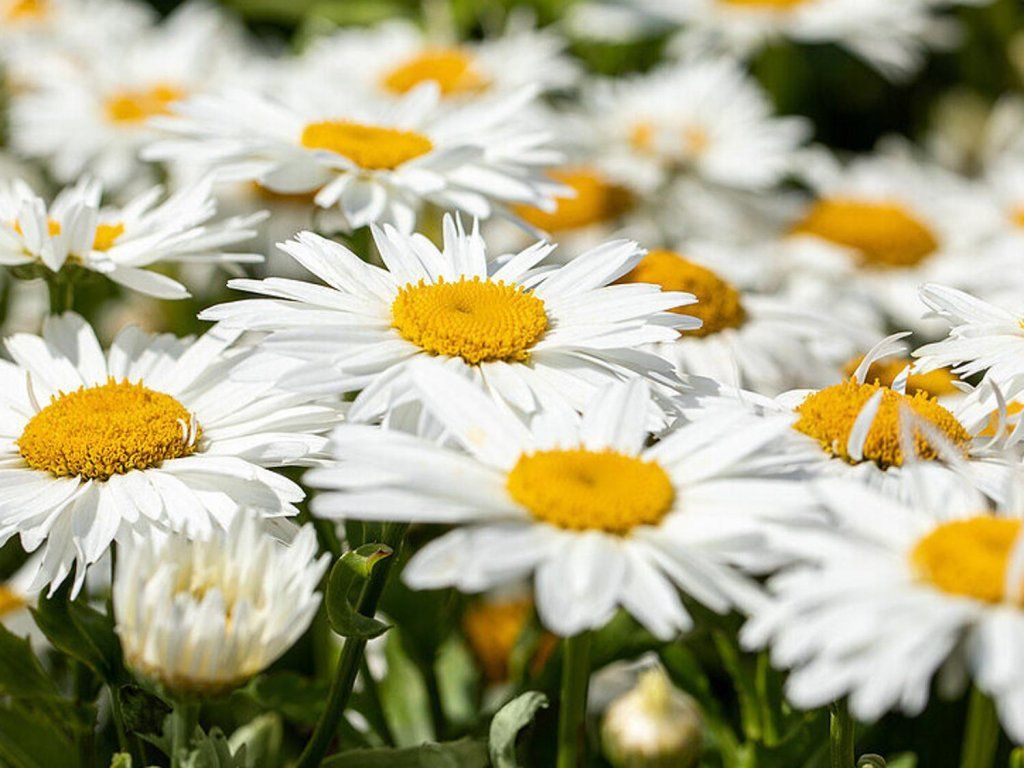 Kultur: Sie gedeiht am besten an voller Sonne, in den wärmsten Gebieten verträgt sie auch leichten Nachmittagsschatten, benötigt aber für eine reiche Blüte mindestens 6 Stunden Licht pro Tag. Wählen Sie einen luftigen Standort in windgeschützter Lage, leichte Luftbewegung reduziert Krankheiten, während starker Wind höhere Stängel abbrechen kann, die dann angebunden werden sollten. Ideal ist ein Mikroklima ohne winterliche Staunässe und ohne Stellen, an denen sich Wasser sammelt. Der Boden sollte mäßig fruchtbar, humos, aber gut durchlässig sein; in schweren Lehmböden sollten Kies, Sand oder Perlit eingearbeitet und stets auf eine Drainage geachtet werden, da Staunässe zu Wurzelfäule und Halsfäule führt. Der empfohlene pH-Wert ist leicht sauer bis neutral (etwa 5,5–6,5, oft wird auch eine Toleranz zum Neutralen angegeben). Man kann im Frühling (März–April) oder im Herbst (September–Oktober) pflanzen. Containerpflanzen können während der gesamten Saison mit ausreichender Bewässerung gepflanzt werden. Nach der Pflanzung regelmäßig bis zur Wurzelbildung gießen, danach eher kräftig und seltener; kurze Trockenheit wird relativ gut vertragen, aber lange Hitzeperioden verkürzen die Blütezeit, daher in der Hitze etwa einmal pro Woche tiefgründig gießen. Sparsam düngen: im Frühjahr mit Kompost oder einem ausgewogenen Dünger, vorsichtig mit Stickstoff, damit die Triebe nicht umfallen. Der Schnitt besteht hauptsächlich im fortlaufenden Entfernen verblühter Blütenköpfe, nach der Hauptblüte kann die Pflanze leicht zurückgeschnitten werden, um eine Wiederblüte zu fördern, und im Herbst die Stiele bodennah kürzen; zur Langlebigkeit die Horste alle 2–3 Jahre teilen. Mit einer dünnen Schicht Kompost oder Kies mulchen, aber den Mulch nicht am Wurzelhals kleben lassen. Im Behälter einen größeren Topf, sehr durchlässiges Substrat mit einer Drainageschicht wählen und im Winter den Behälter vor langfristiger Durchnässung schützen (z.B. unter einem Dach). Für Anfänger ist es entscheidend, nicht zu viel zu gießen und nicht in undurchlässigem Boden zu kultivieren. Die häufigsten Schädlinge sind Blattläuse, Thripse, Weiße Fliegen und Spinnmilben, bei den Krankheiten können Mehltau oder Blattflecken auftreten, insbesondere bei dichter Bepflanzung und hoher Luftfeuchtigkeit. Empfohlene Abstände betragen ca. 45–60 cm je nach Sorte. Die Frostbeständigkeit liegt ungefähr zwischen −20 °C und −29 °C, bei einigen Shasta-Margeriten bis ca. −34 °C, in Behältern ist die Widerstandsfähigkeit immer geringer, da der Wurzelballen schneller durchfriert.
