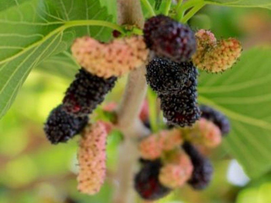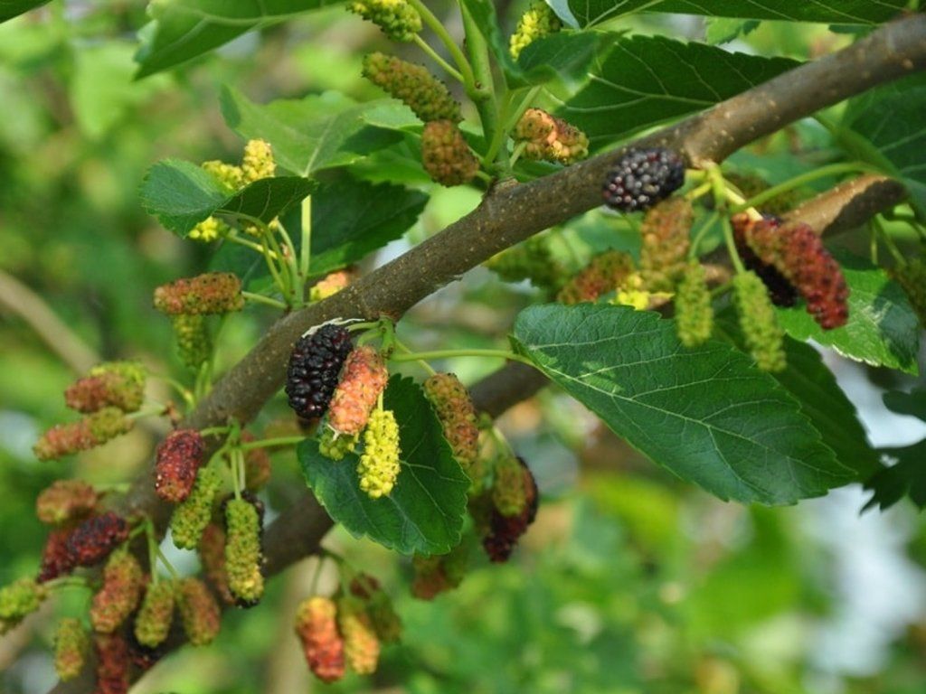 Maulbeere 'Gerardi Dwarf' - ein Zwergobstgehölz, das sich für kleinere Gärten, Vorgärten und niedrige Nutzpflanzungen eignet. Sie entstand aus der Auswahl niedriger Pflanzen in Nordamerika und kombiniert kompaktes Wachstum mit guter Fruchtbarkeit. Unter unseren Bedingungen bildet sie einen mittelstark wüchsigen Strauch oder einen niedrigen Baum von etwa 1,5–2 m Höhe und 2–3 m Breite, je nach Standort und Schnitt. Die Krone ist dicht verzweigt, leicht aufrecht bis halbkugelförmig, die Äste sind dornenlos und lassen sich leicht auf einer niedrigeren Höhe halten, die für eine bequeme Ernte geeignet ist. Die Blätter sind wechselständig, eiförmig bis elliptisch, 6–12 cm lang, auf der Oberseite tiefgrün und eher matt, auf der Unterseite heller, im Herbst verfärben sie sich oft gelblich. Die Blüten erscheinen im Mai bis Juni, hauptsächlich an kurzem Holz des Vorjahres. Sie sind klein, gelbgrün, in kurzen Kätzchen und dienen als Pollenquelle für Bienen und andere bestäubende Insekten. Die Sorte ist selbstfruchtbar, daher trägt sie auch als Solitär Früchte, die Anwesenheit anderer Maulbeeren kann jedoch die Fruchtbildung leicht erhöhen. Die Früchte sind länglich, bei voller Reife dunkelrot bis fast schwarz, mit feinem Reif, etwa 3–4 cm lang. Das Fruchtfleisch ist saftig, weich, süß bis süß-sauer, mit einem feinen Aroma, das an Brombeeren und Waldfrüchte erinnert. In wärmeren Regionen der Tschechischen Republik reifen die ersten Früchte in der Regel ab Ende Juni, die Haupternte findet im Juli statt und ein Teil der Ernte erstreckt sich bis in den August, so dass der Baum eine längere Periode frischer Früchte liefert. Die Beeren eignen sich zum direkten Verzehr, für Obstsalate und Desserts, für Marmeladen, Fruchtmuse, Sirupe und Säfte und lassen sich gut einfrieren. Die Früchte enthalten Vitamin C, Vitamin E, Farbstoffe aus der Gruppe der Anthocyane und Ballaststoffe und tragen zur Vielfalt der Sommerernährung bei.