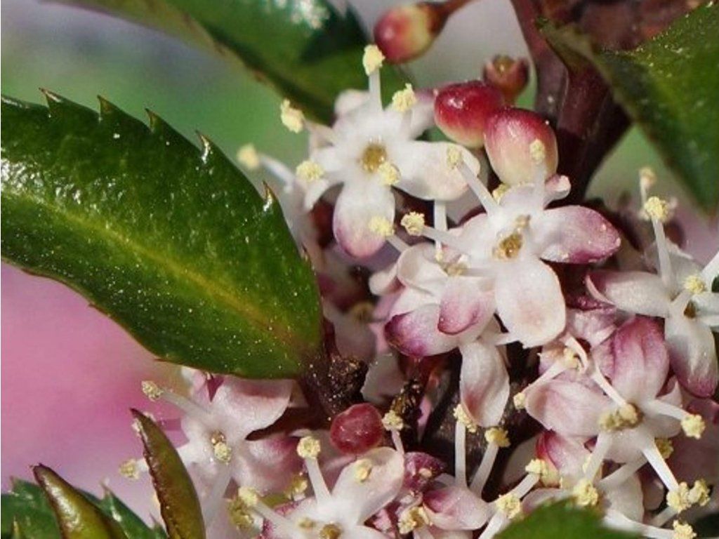 Ilex meserveae 'Gentle' - anspruchsloser, immergrüner Strauch, der bis zu 0,7 m hoch und 0,5 m breit wird. Die Blätter sind zart, leicht gezähnt, in glänzend dunkelgrüner Farbe. Von Herbst bis Frühling nehmen sie jedoch einen ausgeprägten rötlichen bis violetten Farbton an. Dieser Kultivar zeichnet sich auch durch eine reiche Blüte im Frühling aus. Die Blüten sind weiß, mit einem zarten, rosafarbenen Schimmer.