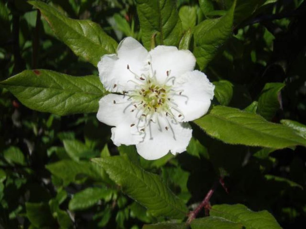 Crataegomespilus dardari - ein interessanter Hybrid zwischen Weißdorn und Mispel. Dieses ungewöhnliche Gehölz entstand durch natürliche Kreuzung oder Züchtung und kombiniert die Eigenschaften beider Elternteile. Es handelt sich um einen kleineren Baum oder Strauch, der eine Höhe von 4–6 Metern erreicht und eine kompakte, kugelförmige Krone bildet. Die Blätter sind laubabwerfend, länglich bis eiförmig, dunkelgrün mit einem fein gesägten Rand. Im Herbst verfärben sie sich in warme Gelb- und Orangetöne. Im Frühling blüht er mit weißen oder hellrosa Blüten, die an die Blüten des Weißdorns erinnern. Sie locken Bienen und andere Bestäuber an. Auf die Blüten folgen Früchte, die der Mispel ähneln, aber kleiner sind. Sie ist ideal für Hecken, Solitärpflanzungen oder als Teil von gemischten Beeten.Sie sind klein, kugelförmig und haben eine gelbbraune bis rötliche Farbe. Sie sind essbar und können zur Herstellung von Marmeladen oder anderen verarbeiteten Produkten verwendet werden, können aber frisch einen bitteren Geschmack haben. Durch Reifung und Frost werden sie süßer. Er kommt als interessanter Solitär gut zur Geltung.