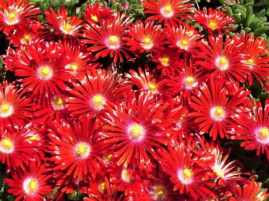 Eiskraut 'Red Mountain' - eine robuste und winterharte Sorte des Eiskrauts. Es ist sehr beliebt für seine feurig rot-orangen Blüten und sein niedriges, bodendeckendes Wachstum. Es erreicht eine Höhe von ca. 10 cm und eine Breite von etwa 40–50 cm. Die Blüten sind leuchtend rot-orange, haben einen Durchmesser von ca. 3–5 cm, mit weißen oder cremefarbenen Mittelaugen um gelbe Staubblätter. Die Blütezeit beginnt von Mai bis September. Es ist ideal für Steingartenbeete, Trockenmauern, in Gefäßen oder als niedriger Bodenteppich unter Bäumen. Hervorragend in Kombination mit anderen trockenheitsliebenden Stauden, Sukkulenten oder niedrigen Steinen.