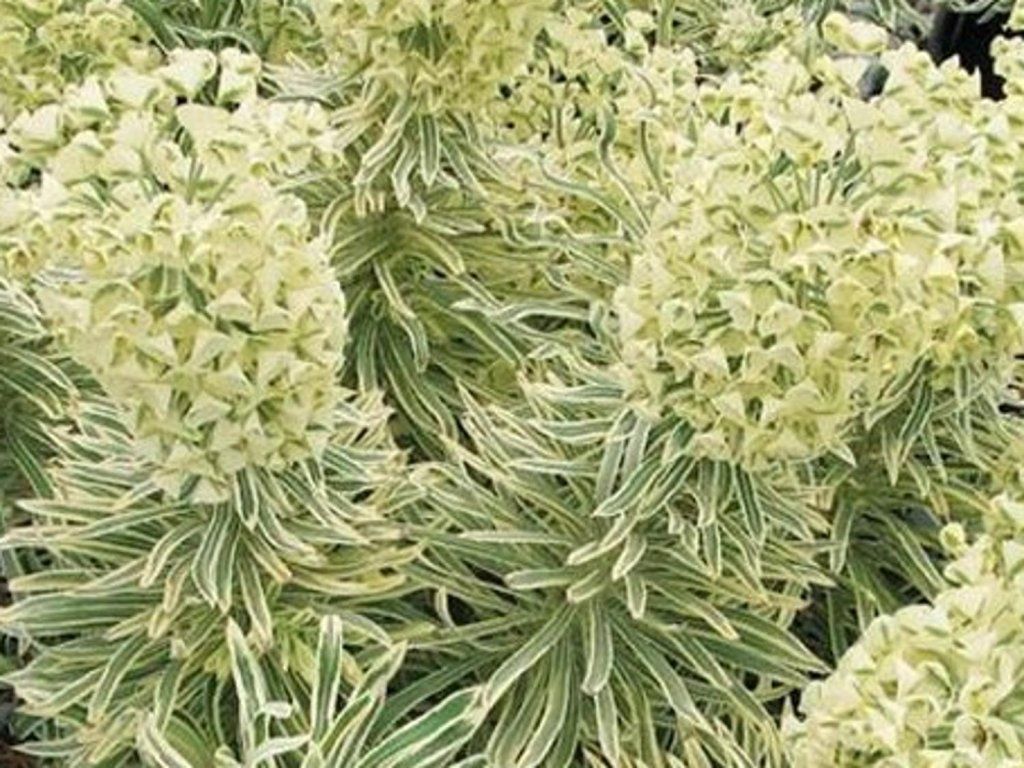 Euphorbia characias 'Tasmanian Tiger' - beliebte Staude, die eine Höhe von 50-90 cm erreicht. Bildet kompakte, dichte Horste mit aufrechten Stängeln. Graugrüne Blätter haben einen attraktiven, cremeweißen Rand, der an Tigerstreifen erinnert. Die Blütenstände bilden cremegelbe Blüten, die von Mai bis Juni blühen und ein wahrer Anziehungspunkt für Bienen und Schmetterlinge sind. Geeignet für Steingärten oder Staudenbeete.