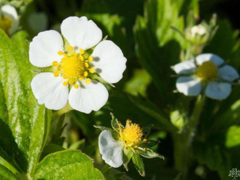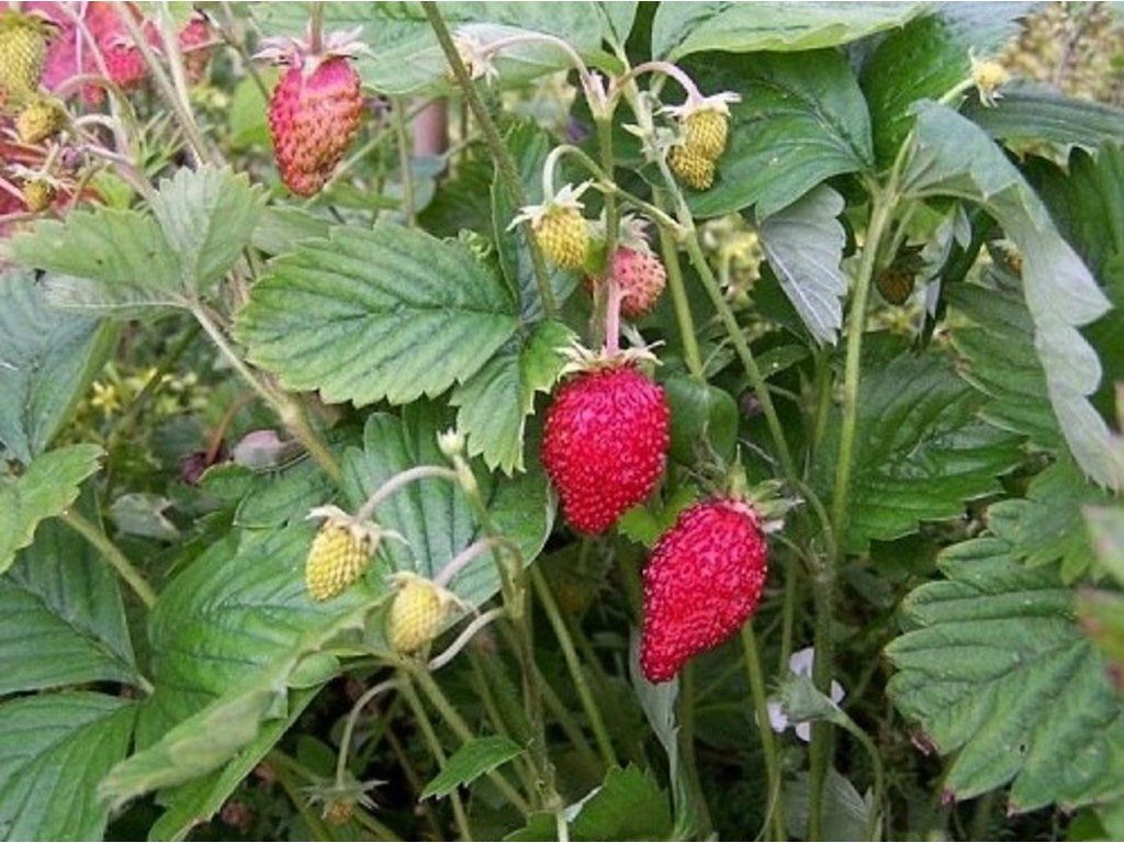 Monatserdbeere 'Rugia' - die Sorte 'Rugia' bildet dichte Horste mit dunkelgrünen, dreizähligen Blättern und einen niedrigen Bewuchs von etwa 0,20 m, der sich in Beeten durch Ausläufer ausbreiten kann. Ab Mai erscheinen weiße, fünfzählige Blüten mit auffälliger gelber Mitte, die für Bestäuber attraktiv sind, und nach der Bestäubung bildet sie nach und nach schlanke, längliche Früchte. Die Erdbeeren reifen in der Regel von Mitte Juni bis zu den ersten Herbstfrösten, sind kleiner als Gartenerdbeeren, duften aber intensiv und schmecken nach Walderdbeeren. In der Küche werden sie frisch verwendet, für Quarkdesserts, auf Pfannkuchen, in Sirupen und feinen Marmeladen. Die Früchte enthalten von Natur aus Vitamin C, Ballaststoffe und Polyphenole, weshalb sie zu den beliebten Kleinfrüchten zählen. Im Garten wirken sie unauffällig, aber ausdauernd, als essbare Unterpflanzung unter Sträuchern, an den Rändern von Beeten, an Hängen und in Gefäßen, wo die Ernte griffbereit ist.