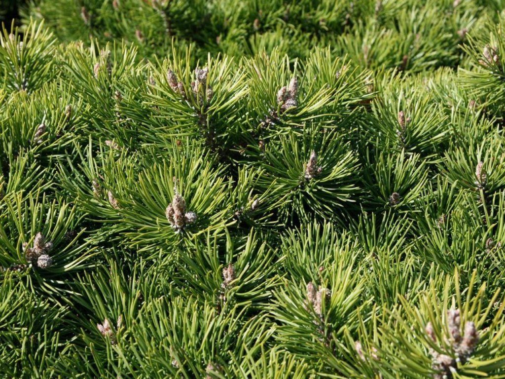 Bergkiefer 'Grüne Welle' - eine Kultivarpinie der Pyrenäenkiefer, eine Bergkiefer, die an Wind, Schnee und steinige Böden angepasst ist. Im Garten bildet sie einen niedrigen, ausladenden Strauch mit dichtem Geäst, der natürlich wirkt und gleichzeitig eine kompakte Form behält. Die Nadeln sind steif, dunkelgrün, in Bündeln zu je zwei Stück, verbleiben an den Trieben mehrere Jahre und bilden eine fein gewellte Textur, die auf Kies- oder Steinschottermulch gut zur Geltung kommt. Das Wachstum ist langsam, im Erwachsenenalter bewegt sich die Sorte normalerweise um 0,5–0,8 m Höhe und 0,8–1,2 m Breite, so dass sie auch in kleineren Gärten eingesetzt werden kann. Sie eignet sich für Steingärten, Vorgärten, Wegränder und auch für Kübel, wo sie eine ganzjährige Struktur ohne Dornen und giftige Früchte bietet. In Kompositionen funktioniert sie gut mit Wacholder, niedrigen Fichten, Heidekrautpflanzen und trockenheitsliebenden Stauden, die den dunklen Nadelton hervorheben. Im Frühling, normalerweise im Mai und Juni, können kleine männliche Blütenzapfen mit gelbem Pollen erscheinen. Im Winter bleiben die Nadeln überwiegend grün.