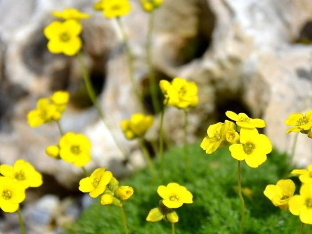 Moos-Hungerblümchen 'Imbricata' - niedrige, ausdauernde Steingartenpflanze aus der Familie der Kreuzblütler (Brassicaceae), geschätzt für seinen außergewöhnlich kompakten, kissenförmigen Habitus. Kleine, graugrüne bis tiefgrüne Blätter sind in dichten Rosetten angeordnet und bilden unregelmäßig geformte Polster, die sich langsam, aber stetig ausbreiten. Von April bis Mai erheben sich über dem Polster kurze Blütenstiele mit kleinen, vierzähligen Blüten von leuchtend gelber Farbe, die in kurzen Trauben angeordnet sind. In warmen Frühjahren kann die Blüte früher beginnen und in höheren Lagen bis in den Juni hinein andauern. Sie bildet ein außergewöhnlich dichtes Polster von 3–5 cm Höhe und etwa 10–20 cm Breite, das auch in kleinen Trögen seine Form behält. Die Pflanze eignet sich gut als feines Füllelement für Fugen zwischen Steinen, für Kiesbeete und für Steingarten-Tröge, wo ihre Form leicht zu erhalten ist. In der Komposition bewährt sie sich neben Steinbrech (Saxifraga), Blaukissen (Aubrieta) und niedrigen Schwertlilien (Iris reticulata), da sie zur ähnlichen Zeit blüht und benachbarte Arten nicht überdeckt. Die Frühlingsblüten sind attraktiv für kleine Bienen und Schwebfliegen, die an kühleren Tagen niedrige, sonnige Bestände aufsuchen. Sie lässt sich gut mit anderen Arten und polsterbildenden Stauden kombinieren.