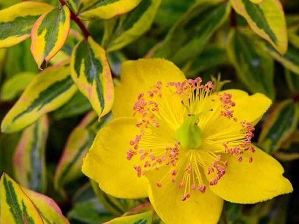 Hypericum moserianum LITTLE MISTERY 'Dunnehyp' - außergewöhnlich anmutige Sorte, die mit ihren dekorativen Blättern und bezaubernden Blüten lockt. Diese Staude erreicht eine Höhe von etwa 0,6 m, was sie zur idealen Wahl für die Verschönerung von Beeten und Gartenrändern macht. Sie bildet ein dichtes Kissen oder einen Teppich, wodurch sie sich ideal zur Verzierung von Beeträndern oder als Bodendecker eignet. Die Blätter sind kleiner, abgerundet und haben eine frische grüne Farbe, ergänzt durch zarte gelbe Ränder, was einen Eindruck von Eleganz und Raffinesse vermittelt. Die Blüten sind auffällig und gelb, erinnern in ihrer Form an Sterne. Sie blühen vom Sommer bis zum Herbst und erzeugen einen hellen und fröhlichen Eindruck. Nach der Blüte bringt 'Little Mystery''Dunnehyp' zusätzliche visuelle Attraktivität, an der Pflanze erscheinen rosa-rote Früchte, die dem reifenden Beet eine weitere Schicht farbenprächtigen Charmes verleihen. Insgesamt ist diese Sorte nicht nur eine ausgezeichnete Wahl für Ziergärten, sondern bietet auch eine lange Blütezeit und ästhetische Freude für Gärtner und Pflanzenliebhaber mit dekorativen Elementen.