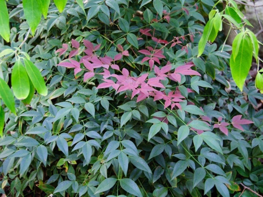 Nandina domestica Flirt 'Murasaki' PBR - Zwergstrauch, der maximal 60 cm hoch und breit wird, Syn. Himmlischer Bambus. Habitus ist rund, kompakt, die Pflanze ist sehr gut verzweigt. Blätter sind unpaarig gefiedert, kräftig. Neue Blattaustriebe haben eine weinrote Farbe, reife Blätter sind dunkelblaugrün und behalten diese Farbe auch über den Winter. Sie sind 10-15 cm lang. Bei milden Wintern wirft sie ihre Blätter nicht ab. Der Strauch blüht nicht. Die Pflanze eignet sich für kleinere Hecken, kommt aber auch in einem Staudenbeet zur Geltung, das sie das ganze Jahr über schmücken wird.