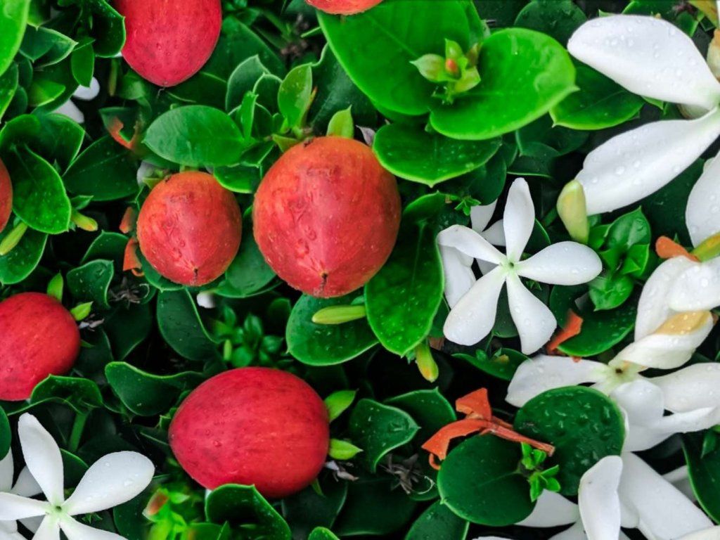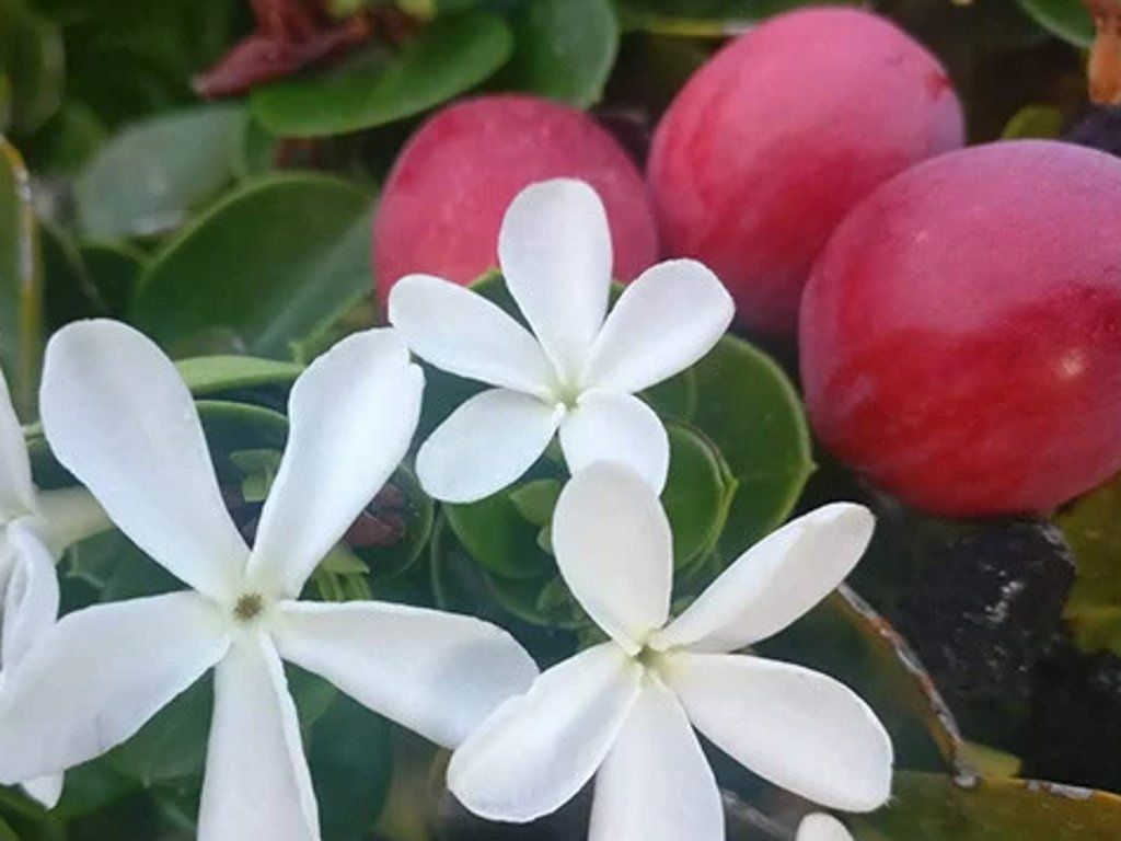 Natal-Pflaume - attraktiver, immergrüner Strauch aus den Küstenregionen Südafrikas. Sie bildet einen dicht verzweigten, kompakten Habitus mit typischen gabelförmigen Dornen, wodurch sie sich auch als schützender Heckenschutz eignet. Unter unseren Bedingungen erreicht sie normalerweise eine Höhe und Breite von 1–2 m, bei der Kultivierung in Behältern bleibt sie kleiner. Die Blätter sind ledrig, elliptisch, dunkelgrün und hochglänzend, was der Pflanze das ganze Jahr über ein dekoratives Aussehen verleiht. Von Frühling bis Sommer, oft wiederholt während des Jahres, blüht sie mit auffälligen weißen, fünfzackigen Blüten mit wachsartiger Textur und einem ausgeprägten süßen Duft, der an Jasmin erinnert. Nach der Bestäubung entwickeln sich eiförmige bis pflaumenförmige Früchte von tiefroter Farbe, die bei voller Reife essbar, saftig und süß-sauer sind. Sie werden sowohl zum direkten Verzehr als auch zur Zubereitung von Marmeladen verwendet. Sie ist tolerant gegenüber Trockenheit und Versalzung, weshalb sie oft in Küstengebieten gepflanzt wird. Die Frostbeständigkeit ist begrenzt (ca. −3 bis −5 °C), daher eignet sie sich vor allem als Kübelpflanze für die Überwinterung an einem kühlen, hellen Ort. Dank ihres dichten Wuchses, der glänzenden Blätter und der dekorativen Früchte stellt sie einen markanten Solitär sowie eine Ergänzung zu mediterran gestalteten Kompositionen dar.