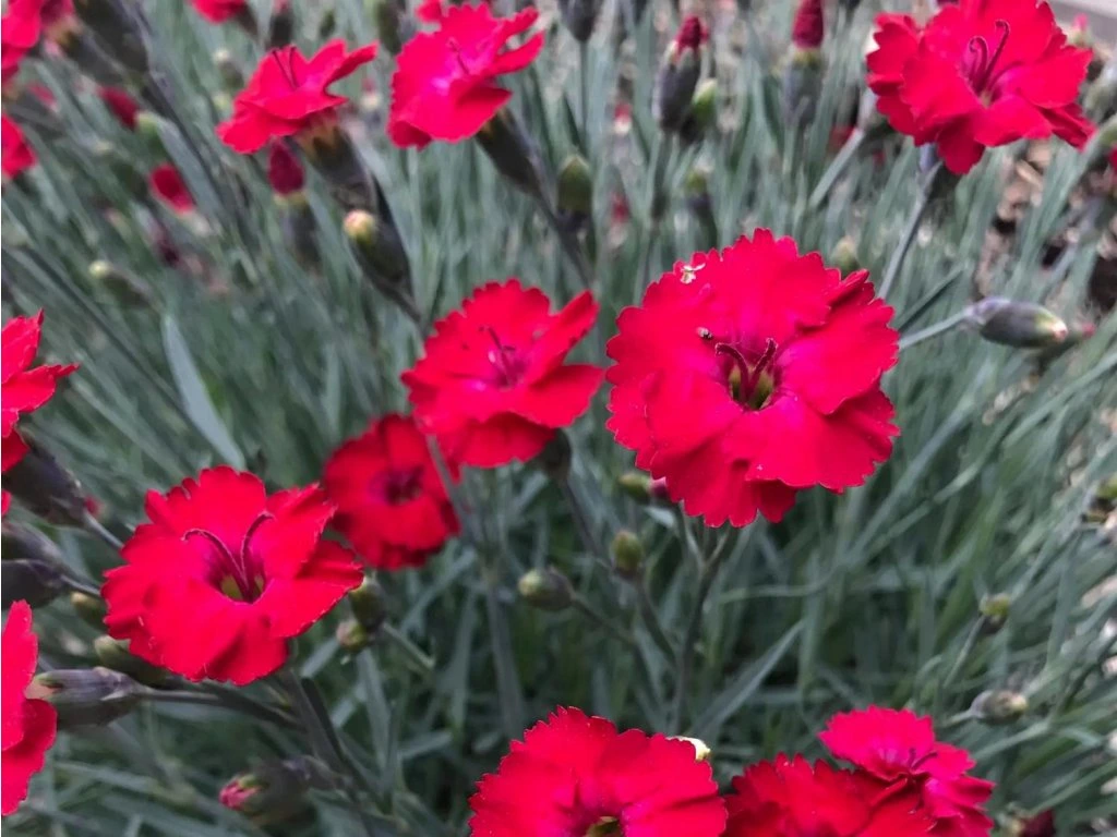 Nelke Mountain Frost Collection 'Red Garnet' - immergrüne Polsterstaude. Erreicht eine Höhe von 15 - 20 cm und eine Breite von 25 - 30 cm. Die Blätter wachsen in Büscheln, sind schmal, steif und silbrig-blau. Blüht mit größeren, intensiv roten Blüten, die einfach und sehr angenehm duften. Der Blütenhals ist durch einen dunkleren Farbton hervorgehoben. Die Blüten sind leicht gewellt und am Rand fein gezackt. Die Blüten erscheinen ab Anfang Juni und blühen den ganzen Sommer über. Die Pflanze eignet sich für Steingärten, Staudenbeete, Einfassungen, Behälter usw.