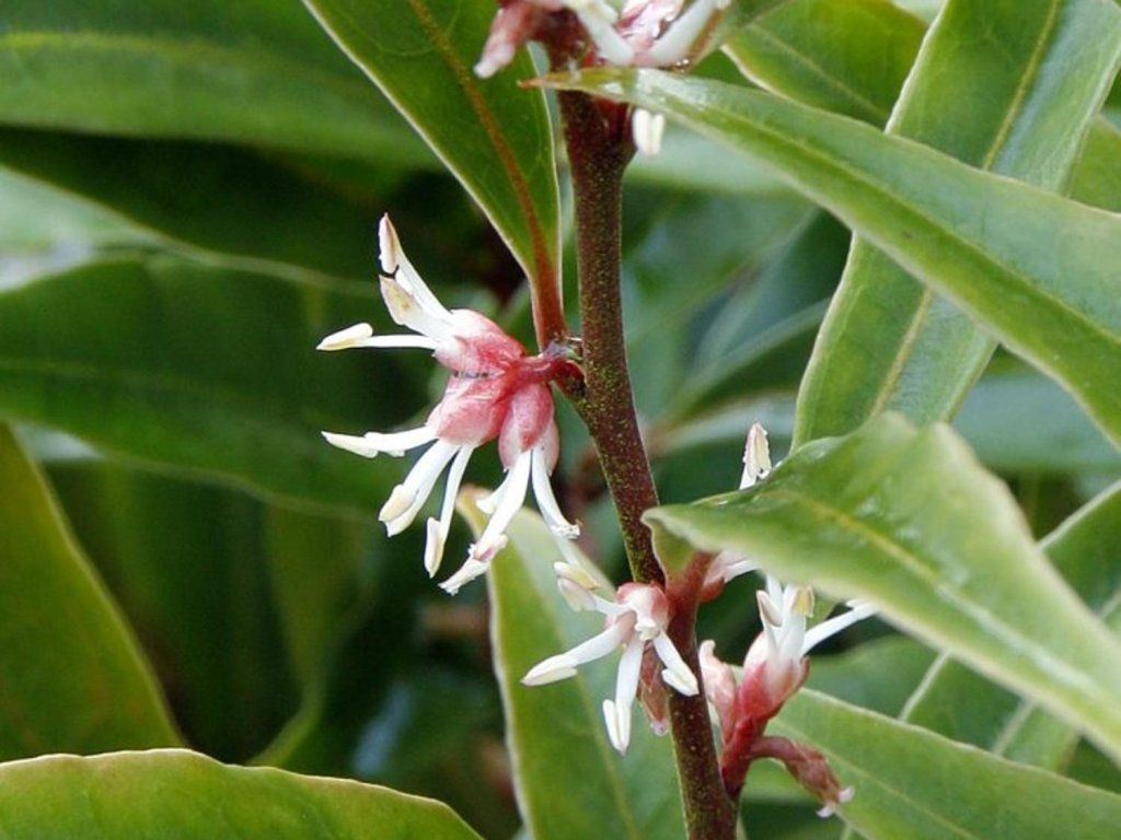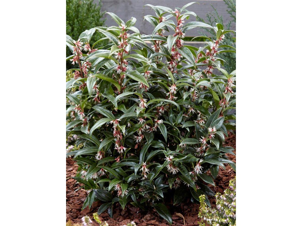 Sarcococca confusa 'Purple Stem' - gehört zur Familie der Buchsbaumgewächse und stammt aus den Bergwäldern des Himalaya und Westchinas, wo sie im Unterholz auf humosen, leicht feuchten Böden wächst. Die Sorte wird oft auch als Sarcococca hookeriana var. digyna 'Purple Stem' angegeben. Ausgewachsene Sträucher werden etwa 0,5–1 m hoch und 1–1,5 m breit. Er wird für seine purpurfarbenen jungen Triebe geschätzt, die einen Kontrast zu den schmal lanzettlichen, ledrigen und glänzenden dunkelgrünen Blättern bilden. Von Januar bis März bilden sich in den Blattachseln unauffällige, aber deutlich duftende Blüten in Weißtönen mit einem Hauch von Rosa und auffälligen Staubgefäßen. Der Duft ist süßlich-moschusartig und kommt am besten im Windschatten eines Weges, am Eingang oder in der Nähe einer Terrasse zur Geltung. Nach der Bestäubung folgen runde, blau-schwarze bis schwarze Beeren, die dekorativ sind und nicht zum Verzehr bestimmt sind. Die Pflanze breitet sich allmählich mit kurzen Ausläufern zu einem dichteren Bestand aus und eignet sich daher als immergrüne Füllung im Halbschatten, als Bodendecker unter Gehölzen und als niedriger, frei wachsender Saum. In Kompositionen lässt sie sich gut mit Christrosen, Farnen, Funkien, Purpurglöckchen und Seggen kombinieren, also mit Arten, die Schatten vertragen und die gleichen Bodenbedingungen schätzen. Die Auszeichnung RHS Award of Garden Merit bestätigt die langjährige Zuverlässigkeit in der Gartenpraxis.