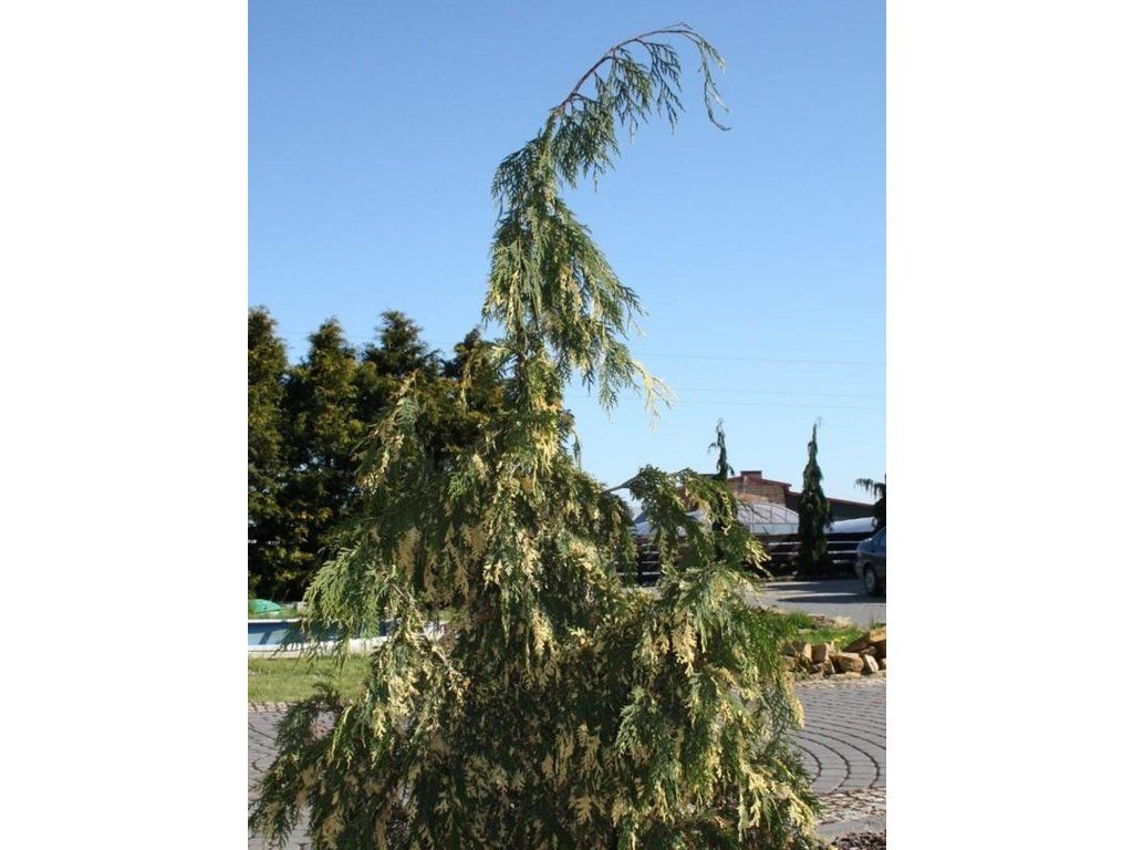 Nutka-Scheinzypresse 'Gloria Polonica' - stammt ursprünglich von der Pazifikküste Nordamerikas von Alaska bis Nordkalifornien. In der Natur wächst er in kühlen und sehr feuchten Gebieten, oft auf Moorböden, Flussufern und in Nebelwäldern, wo er sich durch seine Langlebigkeit auszeichnet. Die Sorte 'Gloria Polonica' ist eine Trauerform mit aufrechtem Wuchs. Sie stammt aus polnischer Selektion, wo sie 1997 als genetische Mutation der Sorte 'Pendula' beschrieben wurde und mit dem Namen von Michał Kałuziński verbunden ist. Sie hat bogenförmig überhängende Zweige, die den Eindruck von weichen Vorhängen erwecken. Die Nadeln sind schuppenförmig, bilden flache Fächer in der Zweigfläche und tragen auffällige cremefarbene Ränder, die sich im Laufe des Jahres mit dunkelgrünen Partien abwechseln. Im Winter bleibt die Farbe eher grün mit cremefarbener Sprenkelung, ohne deutliche Bronzierung. Im Frühling, normalerweise im März bis April, bilden sich die männlichen Blütenzapfen, und die Bestäubung erfolgt durch Wind, ohne dass ein fremder Bestäuber benötigt wird. Mit 10 Jahren erreicht er eine Höhe von etwa 2 m bei einer Breite von ca. 0,7–1,2 m und kann im Erwachsenenalter im Garten etwa 6–10 m hoch und 3–5 m breit werden. Die Äste bilden einen wunderschönen Überhang, bei jungen Pflanzen ist der Überhang auch am Hauptstamm erkennbar, daher ist eine Stütze erforderlich. Mit der Zeit wird der Haupttrieb stärker und richtet sich auf. Er eignet sich als Solitärpflanze, am Wasser und in modernen Pflanzungen, wo die cremefarbenen Töne dunkellaubige Gehölze und Stauden mit purpurfarbenen Blättern, wie z.B. Berberitzen oder Purpurglöckchen, hervorheben. Er kommt auch in Kompositionen mit Steinen und Gräsern zur Geltung, wo die Überhänge die harten Linien mildern.