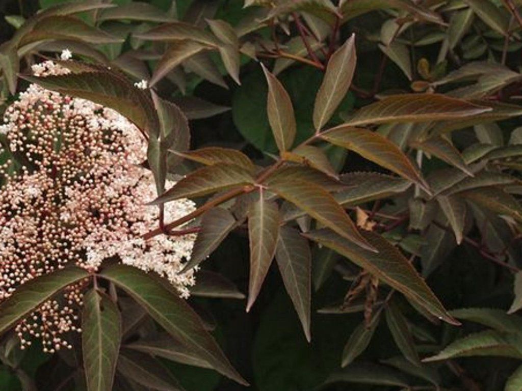 Schwarzer Holunder 'Chocolate Marzipan' - eine neu gezüchtete Sorte von Holunder, die einen kompakten, eher kugelförmigen laubabwerfenden Strauch bildet. Im ausgewachsenen Zustand wächst er je nach Kulturbedingungen bis zu einer Höhe und Breite von 3 - 4 m. Er blüht später als andere, nämlich im Juli und Oktober, wenn die reichen Blütenstände flache, weiße Schirme mit einem rosafarbenen Schimmer und einem süßen Marzipanduft bilden. Die Blätter sind auffällig grün-braun mit einem weißen Streifen in der Mitte, länglich und scharf zugespitzt. Er eignet sich für jede Gruppenpflanzung, kommt aber auch als Solitärpflanze zur Geltung.