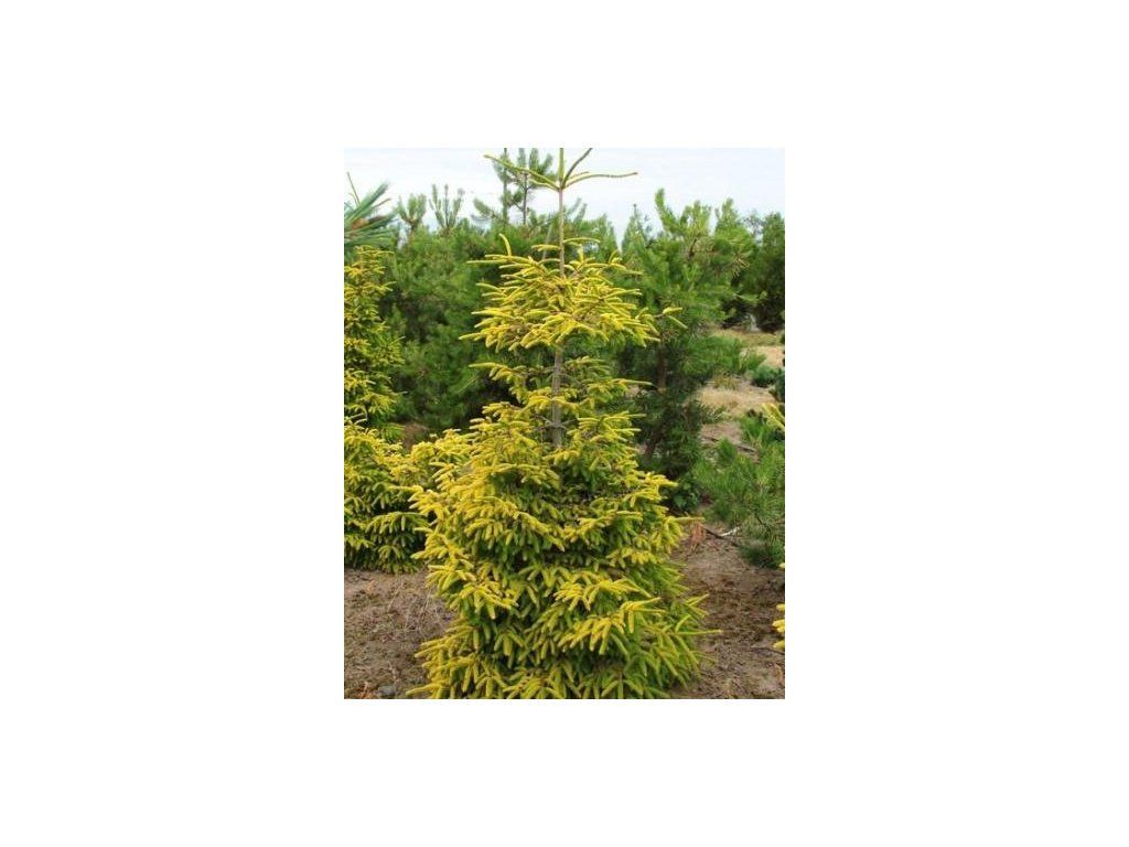 Fichte 'Skylands' - langsam wachsender Fichte, formell sehr kompakt. Verzweigt sich zunächst horizontal, anschließend heben sich die Spitzen nach oben. Das Wachstum ist dicht. Mit 10 Jahren erreicht er eine Höhe von ca. 1,5 m und eine Breite von 0,7 m. Nadeln sind kurz, immergrün und haben eine auffällige goldgelbe bis gelbgrüne Färbung. Diese leuchtende Farbe behalten die Nadeln das ganze Jahr über, die ausgeprägteste Färbung ist natürlich im Winter.