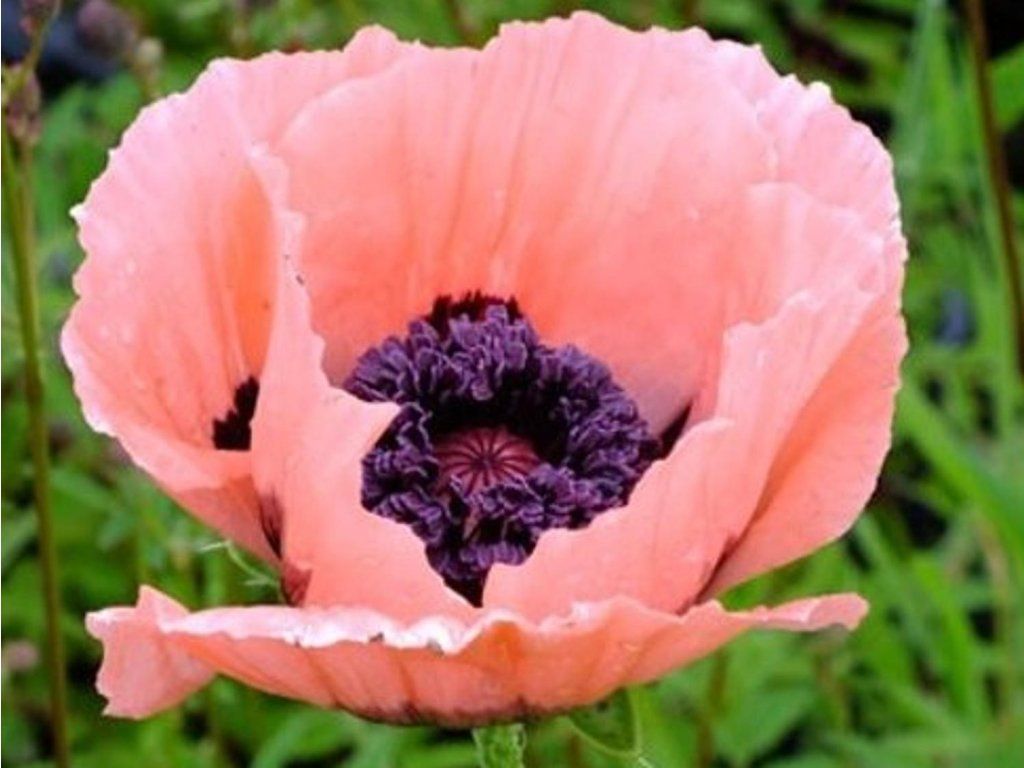 Orientalischer Mohn 'Königin Alexandra' - beliebte Staude, die in Büscheln wächst. Er erreicht eine Höhe von 60-90 cm bei einer Breite von 30-60 cm. Die Blüten sind zart, 'kreppig', lachsrosa, mit einem deutlich dunklen Auge. Er blüht im späten Frühling und frühen Sommer. Die Blätter sind breit, silbrig-grün gefärbt.
