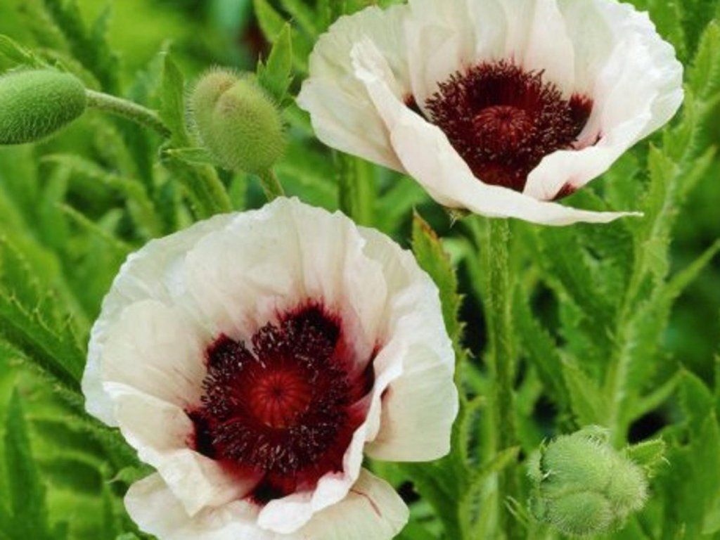 Orientalischer Mohn 'Perry's White' - schöne, reinweiße Blüten heben sich in Kombination mit einem braun-violetten Zentrum ab. Diese Sorte erreicht eine Höhe von 90 cm und eine Breite von 75 cm. Große Blüten blühen von Mai bis Juni.Geeignete Staude für sonnige Standorte