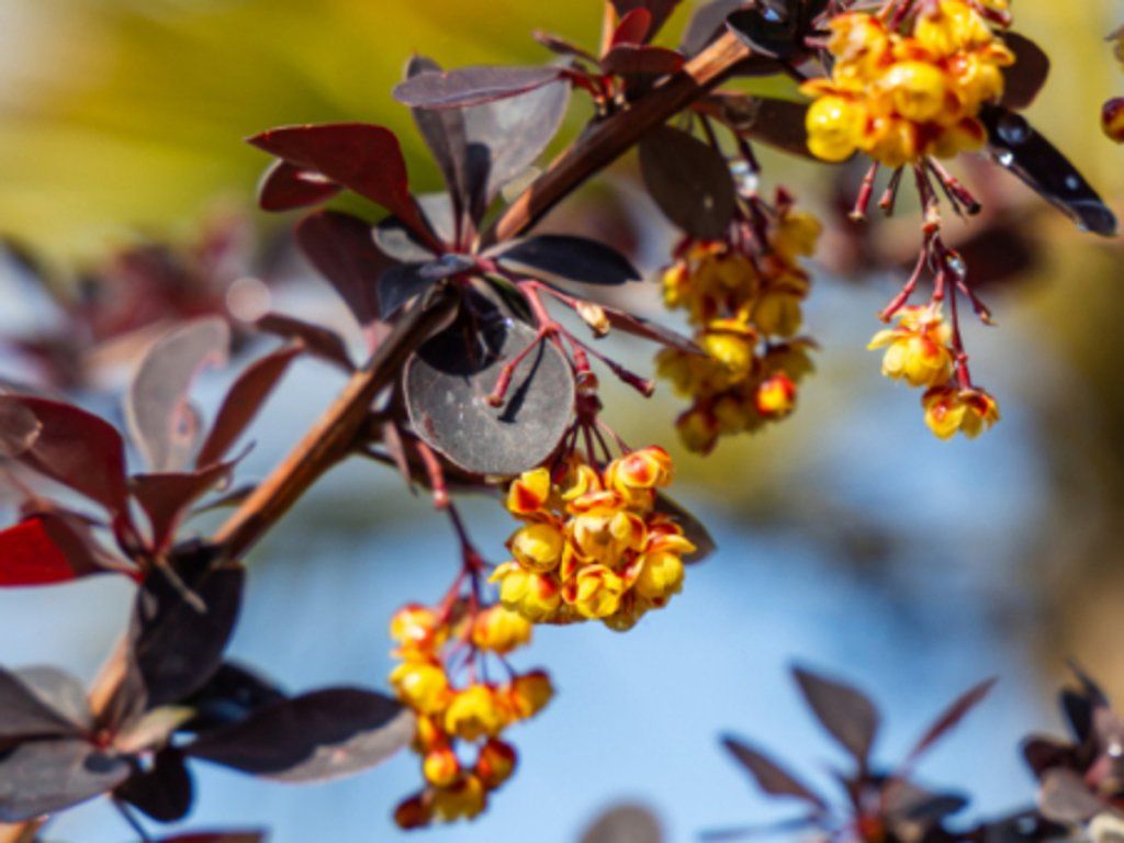 Berberitze von Ottawa 'Auricoma' - eine historische Hybride zwischen B. thunbergii und B. vulgaris, die Anfang des 20. Jahrhunderts in Europa gezüchtet wurde. Sie zeichnet sich durch einen stabilen, kompakten Wuchs und eine ausgeprägte weinrote Blattfarbe aus, die vom Frühling bis zum Herbst sichtbar ist. Die Blätter sind eiförmig, leicht glänzend und nehmen im Laufe der Saison tiefere, bis zu purpurrot-weinrote Farbtöne an. Im Frühjahr trägt sie kleine gelbe Blüten in kurzen Trauben, die eine frühe Nektarquelle für Bestäuber darstellen. Nach der Blüte folgen kleine, rote Beeren, die bis zum Winter am Strauch verbleiben und als Vogelfutter dienen. 'Auricoma' erreicht eine Höhe von etwa 1,5-2 m und eine ähnliche Breite, wächst langsam und bildet einen dichten, gut geschlossenen Strauch mit ausgeprägten Dornen. Sie eignet sich für frei wachsende niedrige bis mittelhohe Hecken, für Stadtbepflanzungen, Vorgärten sowie als farblicher Kontrast in gemischten Beeten. Die weinrote Blattfarbe kommt gut in Kombination mit hellen Stauden, Gräsern oder gelb blühenden Gehölzen zur Geltung. Dank seiner Widerstandsfähigkeit und des geringen Wartungsaufwands ist die Pflanze auch für Anfänger geeignet.