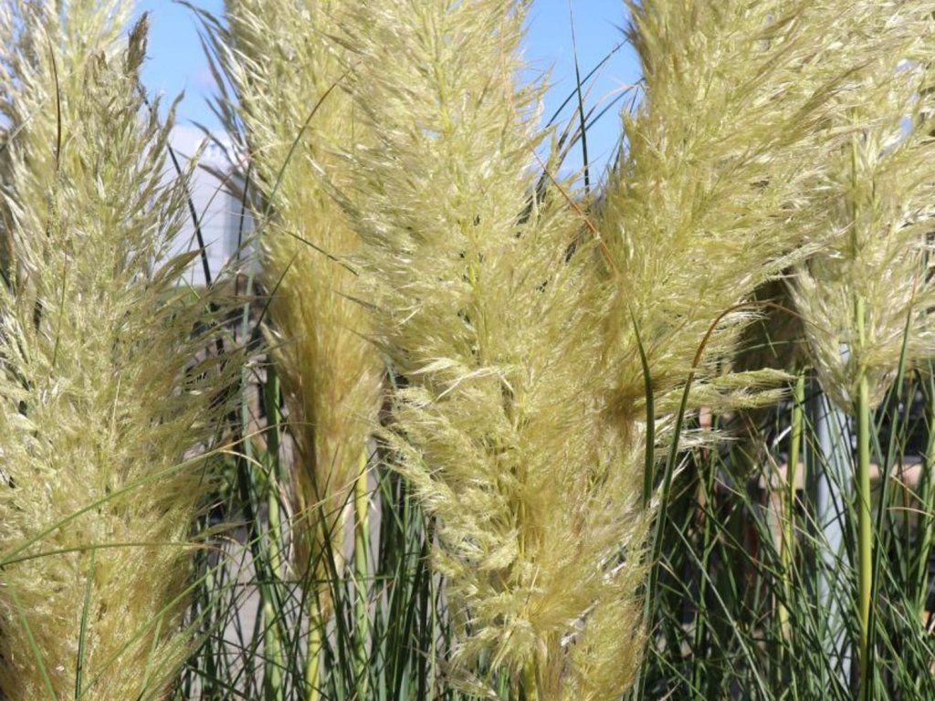Pampasgras (Cortaderia) 'Evita' - ein kompakter Kultivar des Pampasgrases, also ein auffälliges Ziergras, das aus den südamerikanischen Pampas von Argentinien, Brasilien und Chile stammt. Während die botanische Art sehr mächtige Horste bildet, die in der Blüte sogar 2 m überschreiten, wurde der Kultivar 'Evita' wegen seines geringeren Wuchses und seiner besseren Verwendbarkeit in kleineren Gärten und Gefäßen ausgewählt. Im ausgewachsenen Zustand erreicht er eine Höhe von etwa 100–150 cm inklusive Blütenstand und eine Breite von etwa 100–120 cm. Die Blätter sind schmal, lang, bogenförmig überhängend, satt bis graugrün und am Rand scharf, sodass beim Schneiden Vorsicht geboten ist. Von September bis Oktober, manchmal schon ab Ende August, wachsen über dem Horst feste Halme mit dichten, fein aufgeschüttelten Wedeln in einem cremefarbenen, strohsilbernen bis hellbeigen Ton. Die Blütenstände sind etwa 40–50 cm lang und bleiben auch während des Winters dekorativ, wenn sie über den trockenen Halmen leicht und luftig wirken. Die Sorte eignet sich als Solitärpflanze im Rasen, in Schotter- und modernen Pflanzungen, in Kombination mit Sonnenhut, Sedum, Ehrenpreis, Gaura und trockenheitsliebenden Gräsern, aber auch in einem größeren Gefäß auf der Terrasse. Im Vergleich zu hohen Formen des Pampasgrases ist sie besser dort geeignet, wo ein deutlicher Effekt erzielt werden soll, aber ohne zu viel Volumen.