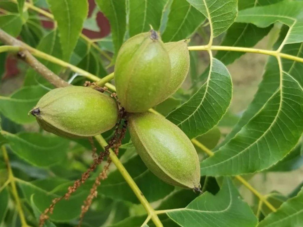 Pekannuss 'Snaps' - ein hoher Laubbaum, verwandt mit der Walnuss. In freier Wildbahn erreichen diese Bäume eine Höhe von bis zu 50 m und stammen aus Nordamerika. Sie blühen normalerweise im Frühling, Ende April oder Anfang Mai. Am Baum wachsen männliche und weibliche Blüten, aber meist nicht zur gleichen Zeit, daher kommt es nicht zur Bestäubung. Es ist notwendig, zwei zu pflanzen. Die Bestäubung erfolgt meist durch den Wind. Anschließend bilden sich Trauben von fleckig braunen Früchten, variable Formen - länger bis zylindrisch, aber auch kürzer bis rund mit spitzem Ende. Die Pekannuss befindet sich in einer Schale, die sich noch unter der fleischigen Schale verbirgt. Die Schale ist härter als bei Walnüssen. Die Früchte reifen im Oktober.