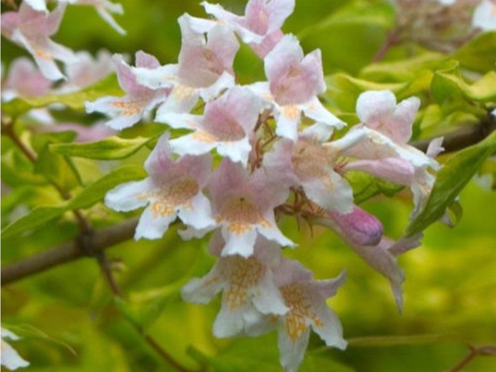 Kolkwitzia amabilis 'Maradco' - kugelförmiger wachsender Strauch mit bogenförmig überhängenden Zweigen, der eine Höhe von 2-3 m erreicht. Die Blätter sind eiförmig, grün-gelb und verfärben sich im Herbst gelb-orange. Kleine, hellrosa, röhrenförmige Blüten erscheinen im Mai und Juni. Sie bedecken praktisch den gesamten Strauch und locken mit ihrem intensiven Duft.