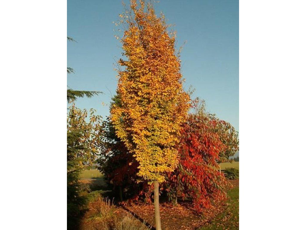 Parrotie persica 'Persian Spire®' - gehört zur Familie der Hamamelidaceae und stammt aus dem Iran und dem Kaukasus, wo sie in Laubwäldern auf tiefgründigen, humosen Böden wächst. Die Sorte 'Persian Spire®' ist eine eng wachsende Selektion, die oft auch unter der Bezeichnung 'JL Columnar' geführt wird und die typische Variabilität der Art in eine schlanke, platzsparende Silhouette überträgt. Unter unseren Bedingungen bildet sie einen kleineren Baum mit einem festen Gerüst, in der Jugend säulenförmig, später leicht eiförmig, normalerweise 4–6 m hoch und 1,5–2 m breit. Die Blätter sind einfach, elliptisch bis eiförmig, etwa 6–10 cm lang, im Sommer glänzend grün. Im Herbst mischen sich auf einem Baum oft gelbe, orange und weinrote Farbtöne, die besonders vor dem dunklen Hintergrund von Nadelbäumen zur Geltung kommen. Dekorative Blüten ohne Kronblätter erscheinen sehr früh, meist im Februar bis März, und bestehen aus Büscheln roter Staubgefäße. Der ältere Stamm und stärkere Äste erhalten allmählich eine mosaikartig abblätternde Rinde in graubraunen bis beigen Tönen. In der Gartengestaltung kommt sie als Solitär, in einer Reihenpflanzung entlang eines Weges und als Vertikale zwischen Gräsern, Farnen, Funkien und früh blühenden Zwiebelblumen zum Einsatz. Lässt sich gut mit Zaubernuss, Viburnum und Japanischem Ahorn kombinieren, die ähnliche Ansprüche an humose Böden stellen, und wirkt am Teich oder im Regengarten natürlich.