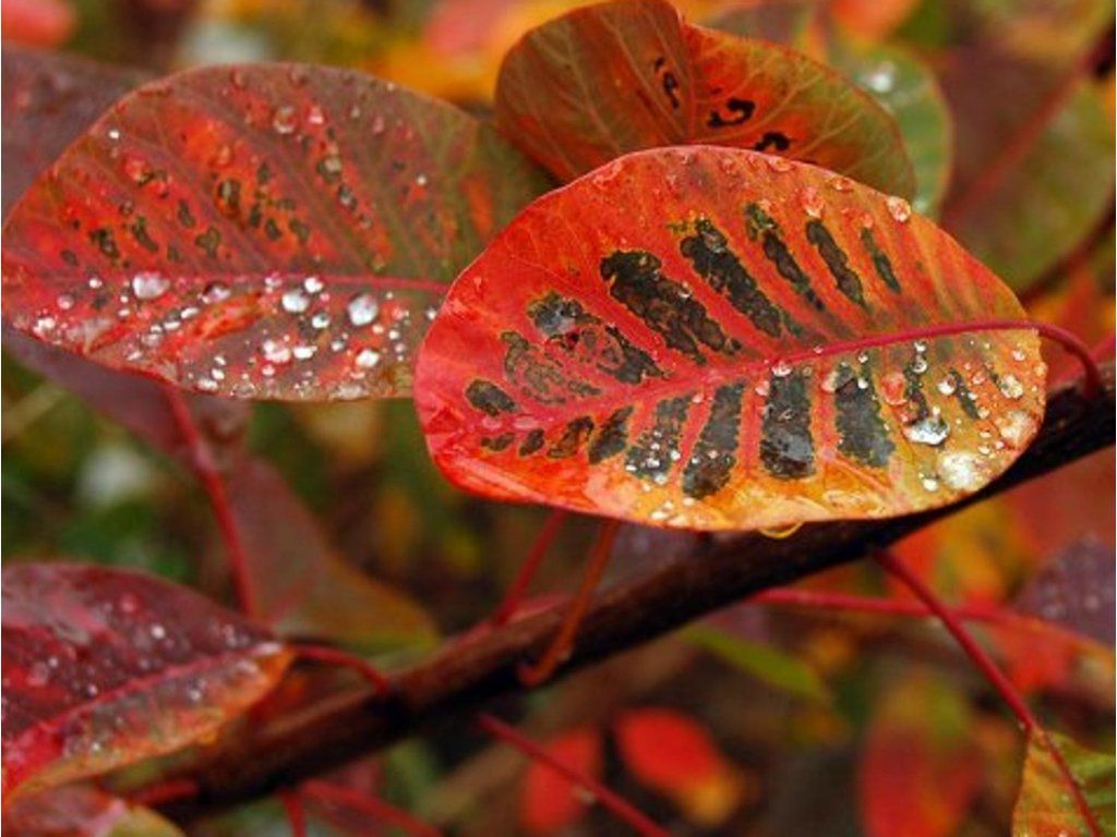 Perückenstrauch 'Flame' - eine wunderschöne Sorte des Perückenstrauchs. Sie hat eine schillernde Herbstlaubfarbe. Er wächst auf eine Höhe von 4 m. Blaugrüne Blätter verfärben sich im Herbst orange und rot. Sie blüht mit rosa-violetten Blüten. Die Blätter sind abgerundet und bis zu 12 cm lang. Sie erhellt Ihren Garten in Herbstfarben.