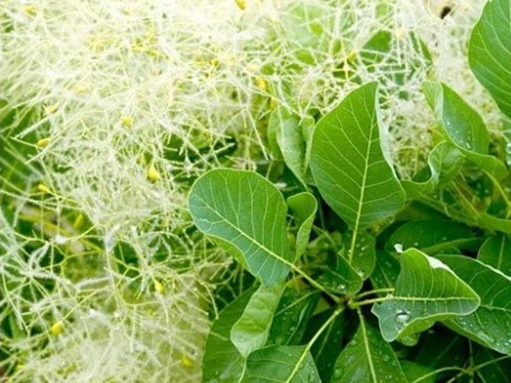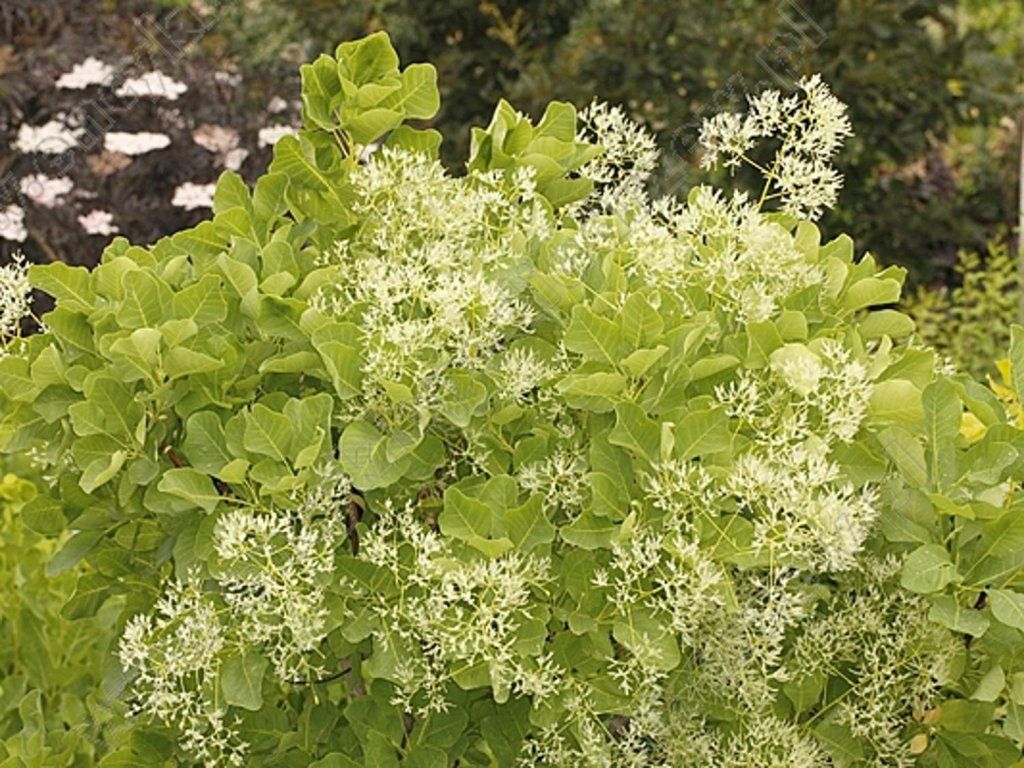 Perückenstrauch 'Kanari' - eine sehr schöne Sorte, die 1,5 - 2,5 m hoch wird. Die Blätter sind kleiner und oval. Sie haben eine gelbgrüne Farbe, die sich im Herbst in violette Farbtöne ändert. Der Blütenstand ist sehr interessant, flaumig und rosa bis violett gefärbt. Diese Pflanze wird in Gruppenpflanzungen eingesetzt.