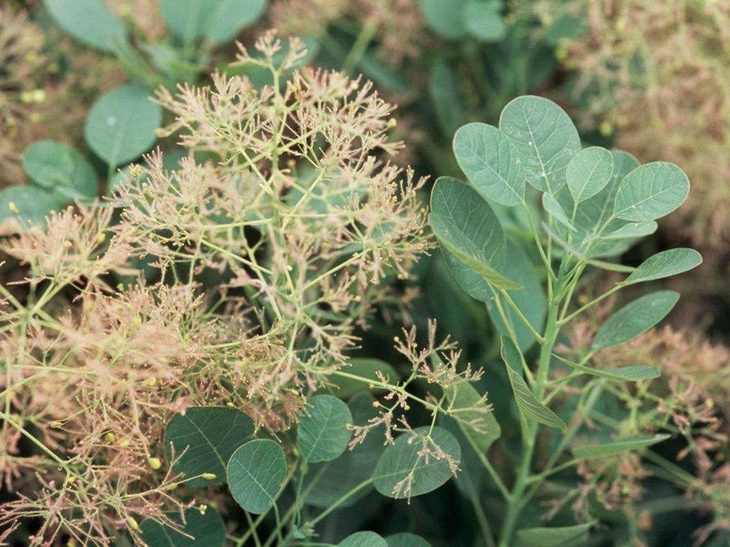 Perückenstrauch lateinisch Cotinus coggygria, ist eine heimische Art eines Strauches oder kleinen Baumes, der für seine dekorativen Blätter und Blüten bekannt ist. Dieser charakteristische Strauch stammt aus Südeuropa, insbesondere dem Mittelmeerraum, sowie aus Zentralchina. Der Strauch oder kleine Baum kann eine Höhe von 3-5 m erreichen. Die Blätter sind wechselständig, oval bis eiförmig, in grau-grünen Tönen gefärbt, mit ausgeprägter Herbstfärbung in Rottönen, Orange bis Purpur. Seine Blütezeit, die von Juni bis August stattfindet, bringt kleine Blüten hervor, die in kegelförmigen Blütenständen angeordnet sind, welche zwar nicht auffällig sind, aber interessante Blütenrispen von 15 bis 29 cm Länge bilden. Eine begrenzte Anzahl dieser Blüten entwickelt sich nach und nach zu kleinen Früchten, während die verbleibenden Blütenstiele sich verlängern und zu rötlichen Haaren werden, die den Eindruck erwecken, der Strauch sei von einer Rauchwolke umhüllt, was ihm in englischsprachigen Ländern den Spitznamen 'Smoke tree' (Rauchbaum) eingebracht hat. Im frühen Herbst ist der Perückenstrauch dank ihnen am schönsten. Der Perückenstrauch gedeiht am besten an warmen und sonnigen Standorten, wobei mehr Sonne zu stärkerem Wachstum und einer augenfreundlichen Herbstfärbung führt, insbesondere bei Sorten mit roten Blättern. Er bevorzugt sonnige bis halbschattige Standorte und benötigt gut durchlässigen Boden mit Kalziumgehalt, was seine relativ pflegeleichte Handhabung und hohe Widerstandsfähigkeit gegen Trockenheit und vielfältige Bedingungen garantiert. Mit seinem besonderen Habitus, Laub, Blütenstand und Fruchtstand ist der Perückenstrauch so eigenartig, dass er sich nicht gut für die Kombination mit anderen Pflanzen eignet. Er kommt besser als markante Solitärpflanze auf der Gartenfläche oder in einem Streifen zwischen Gehölzkulturen zur Geltung. Schön ist er in Kombination mit größeren Steinen und Steinmulch. Rote Sorten wachsen langsamer und sind bedeutende Solitärgehölze, auch für kleinere Pflanzungen geeignet, wo sie als auffällige dominante Pflanze zur Geltung kommen können.
