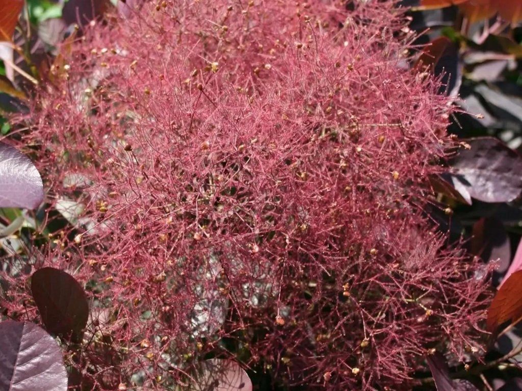 Perückenstrauch MAGICAL RED FOUNTAIN ´Kolmarfo´ - eine außergewöhnliche Sorte mit ausgeprägten Farben während der gesamten Saison. Dieser laubabwerfende Strauch zeichnet sich durch dichtes Wachstum und üppige Blüte aus. Seine Blätter sind dunkelweinrot bis rot, breit und gekerbt. Er erreicht eine Höhe von 2 Metern bei einer Breite von 1,5 Metern. Die Blüte ist sehr attraktiv, Büschel von federartigen Blüten erzeugen einen rauchigen Eindruck. Sie hat eine sehr ähnliche Farbe wie die Blätter, nur heller. Sie dauert ziemlich lange.