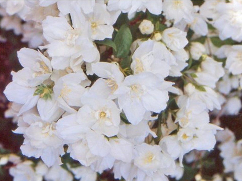 Pfeifenstrauch 'Mrs. E.L. Robinson' - kompakter Hybrid, der bis zu 1,2 m hoch und 1,5 m breit wird. Ovale Blätter haben eine hellgrüne Farbe. Ende des Frühlings wird er durch halbgefüllte, reinweiße Blüten mit einem Durchmesser von 2,5-3,5 cm ergänzt. Sie bilden Gruppen von 3-4 Blüten. Sie blühen Ende Juni/Anfang Juli. Die Blüten sind stark aromatisch.