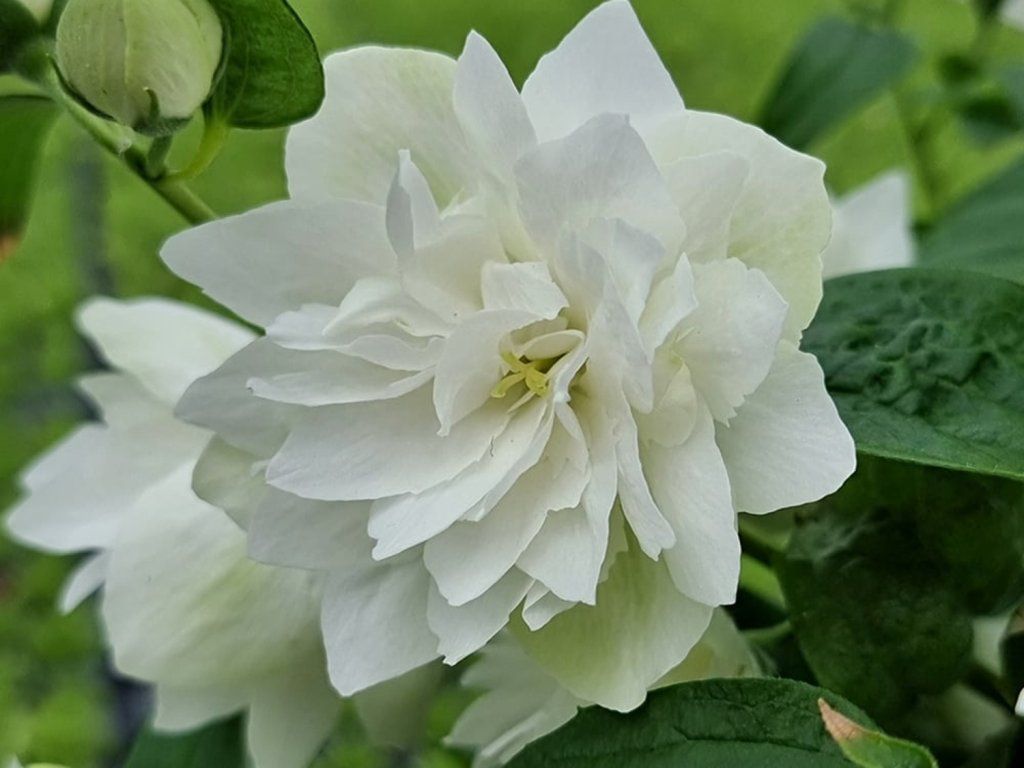 Falscher Jasmin 'Perle des Parfüms' - die Sorte zeichnet sich durch große, vollgefüllte Blüten in reinweiß mit einem ausgeprägten Zitrus-Jasmin-Aroma aus. Das Einzigartige an der Sorte ist die wiederholte Blüte vom späten Frühjahr bis in den Sommer. Knospen erscheinen nicht nur an den letztjährigen Zweigen, sondern auch am neuen Zuwachs. Er erreicht eine Höhe von ca. 1,2 m und eine Breite von ca. 0,6 m. Die Sorte ist ideal für kleinere Gärten oder Kübelpflanzungen, macht sich aber auch als Solitär oder zur Belebung von Beeten auf Terrassen oder am Eingang gut. Sie eignet sich auch für den Schnitt in die Vase, die Blüten sind groß und langlebig.
