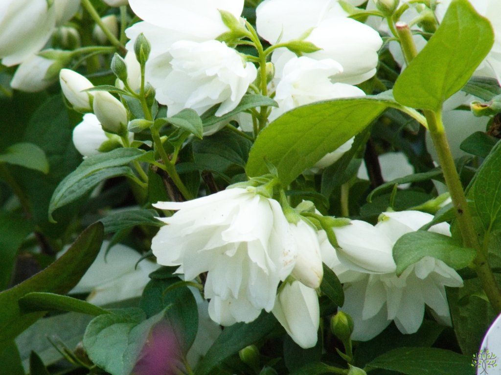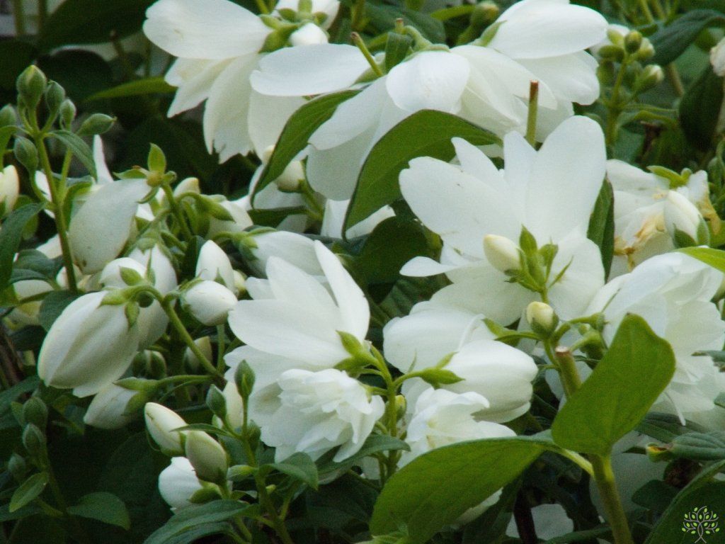 Flieder 'Snowbelle' - eine kompakte Philadelphus-Sorte, die sich durch volle, cremeweiße Blüten mit intensivem süßem Duft auszeichnet. Er erreicht eine Höhe von etwa 1–1,2 Metern und eine Breite von etwa 60–90 cm, wodurch er auch für kleinere Gärten oder die vorderen Bereiche von Beeten geeignet ist. Er blüht reichlich vom späten Frühling bis zum frühen Sommer, wenn seine Zweige mit einer Vielzahl von großen, dicht gefüllten Blüten bedeckt sind, die sehr elegant und romantisch wirken. Dank seiner geringeren Größe und seines wunderbaren Duftes wird er gerne in der Nähe von Wegen, Terrassen oder Sitzbereichen gepflanzt, wo seine Schönheit und sein Duft am besten genossen werden können.