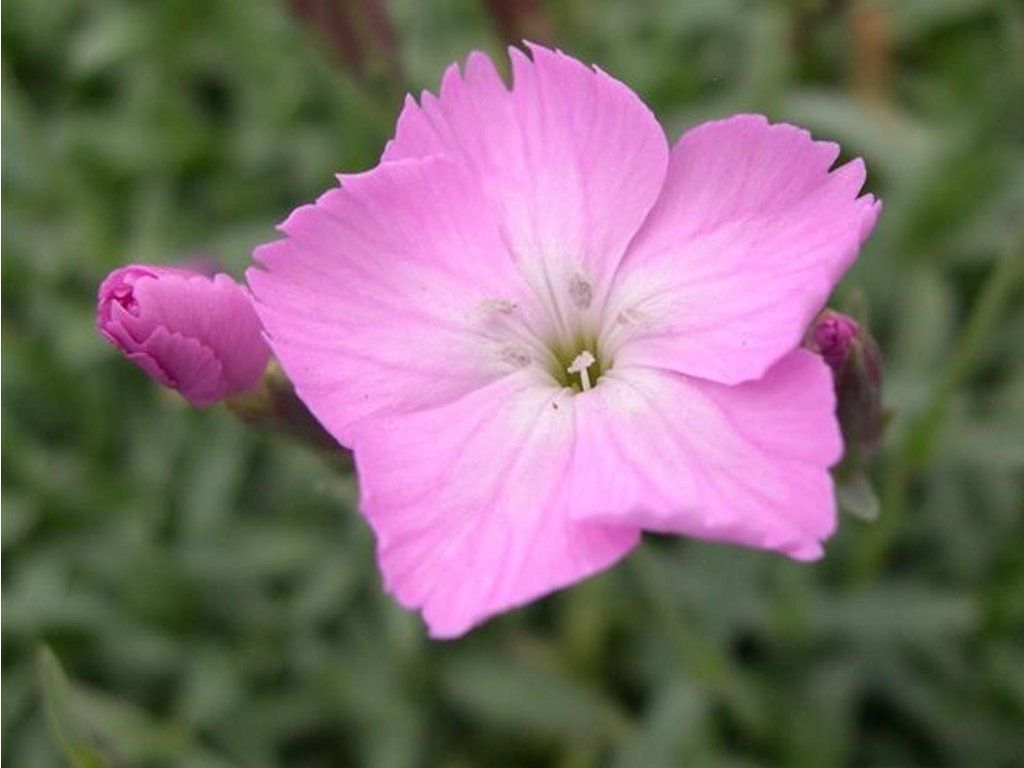Pfingstnelke 'La Bourboule' - eine beliebte Steingartenstaude für jeden Garten. Eine niedrige Steingartenstaude aus der Familie der Nelkengewächse (Caryophyllaceae). Die Sorte ist in europäischen Gärten erprobt und wird in britischen Übersichten mit der RHS Award of Garden Merit ausgezeichnet. Die Pflanze ist immergrün und bildet dichte, kissenförmige Horste aus schmalen, graugrünen bis silbrigen Blättern, die auch außerhalb der Blütezeit dekorativ bleiben. Im ausgewachsenen Zustand erreicht sie eine Höhe von etwa 8–10 cm, die Blütenstiele sind etwa 10 cm hoch und meist 20–50 cm breit. Im Mai und Juni trägt sie einfache Blüten von ca. 2 cm, leuchtend rosa, mit einem fein gezackten Rand der Blütenblätter und einem typischen Nelkenduft. Die Blüten werden von Bienen und Tagfaltern besucht, und der kompakte Habitus kommt in Steingärten, auf Trockenmauern, in Kiesbeeten und an Beeträndern zur Geltung. Er erreicht normalerweise innerhalb von 2–5 Jahren seine volle Größe und behält in gut durchlässigem Boden ein dichtes Zentrum ohne Verkahlung. Sie kommen in Gefäßen sehr gut zur Geltung. Sie lässt sich gut mit anderen Arten und polsterbildenden Stauden kombinieren.