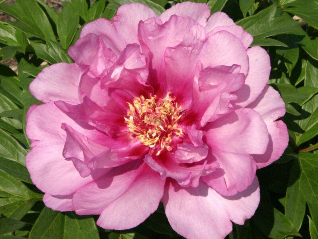 Pfingstrose Itoh 'First Arrival' - handelt es sich um eine Kreuzung zwischen einer baumartigen und einer chinesischen Pfingstrose. Sie erreicht eine Höhe von 90–120 cm. Sie hat wunderschöne und romantische Blüten, die sich durch eine Kombination aus pastellrosa Blütenblättern mit weinroten Zentren und gelben, fein behaarten Staubblättern auszeichnen. Diese Pfingstrose blüht von Mitte Mai bis Mitte Juni. Wenn Sie sie bodennah zurückschneiden, wird sie im Laufe des Sommers erneut blühen. Die Blätter sind dunkelgrün, geteilt und mit dem Einsetzen der Herbsttemperaturen färben sie sich in weinrote, orange, gelbe und scharlachrote Farbtöne. Sie ist für den Schnitt geeignet.