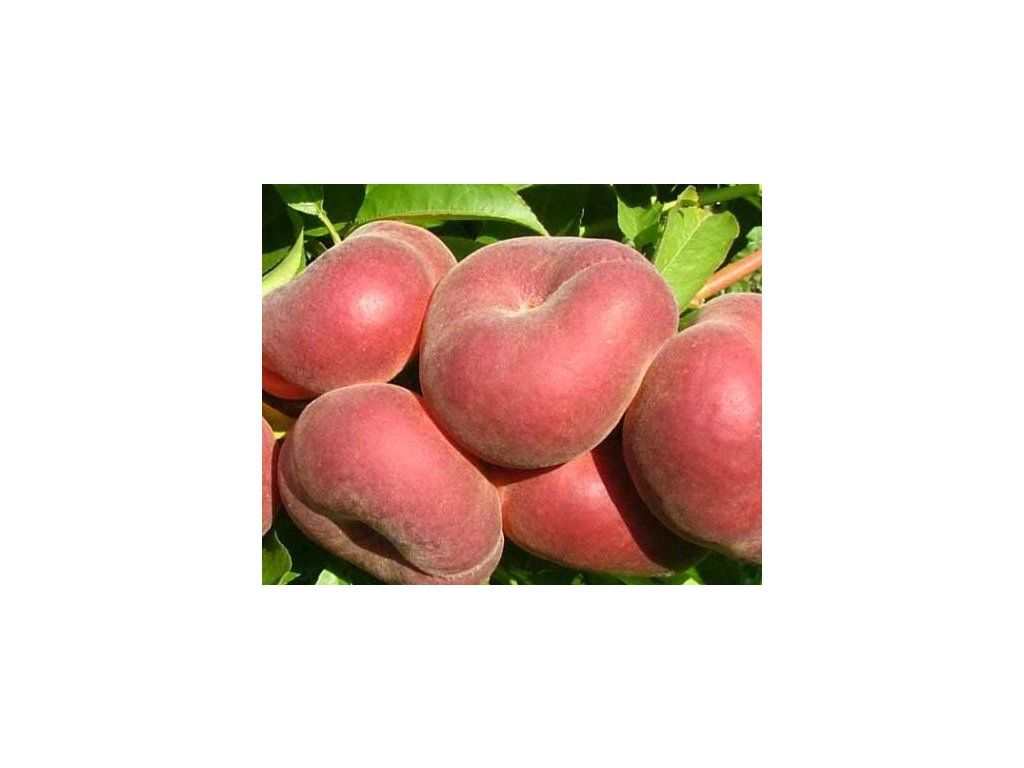 Pfirsich 'Platifun Platty' - hochproduktive Sorte mit flachen Früchten, mit intensiver roter Backe, die fast die gesamte Oberfläche der Früchte bedeckt. Das Fruchtfleisch ist weiß und hat einen ausgezeichneten süßen Geschmack. Die Früchte reifen bereits Anfang Juli.