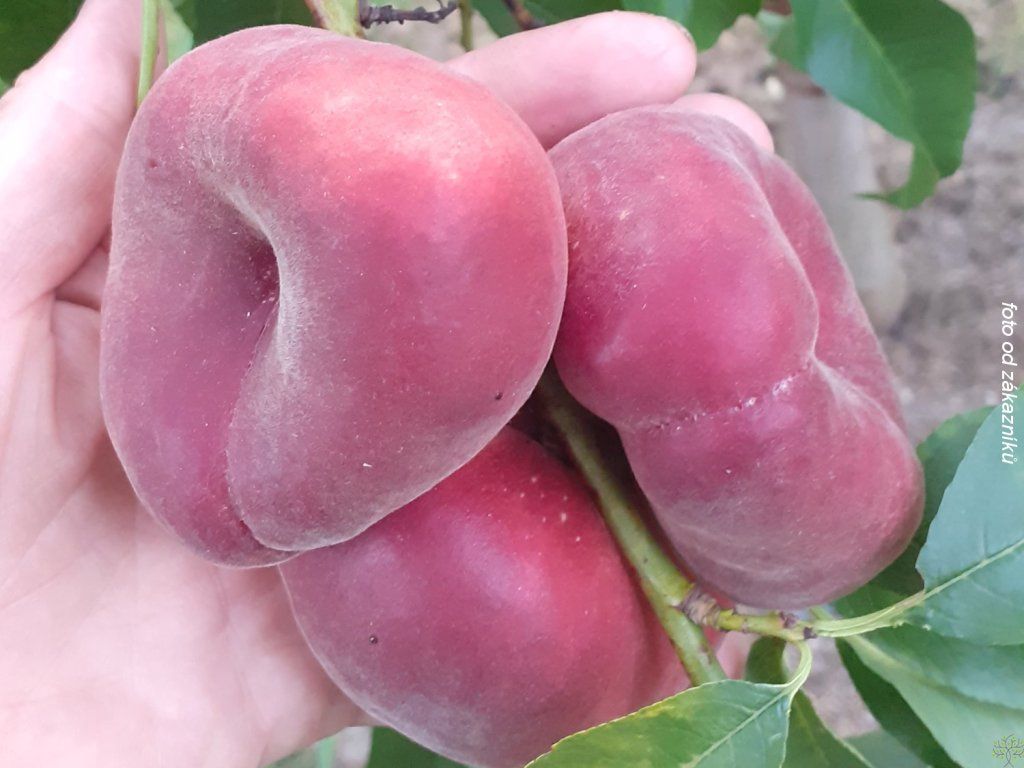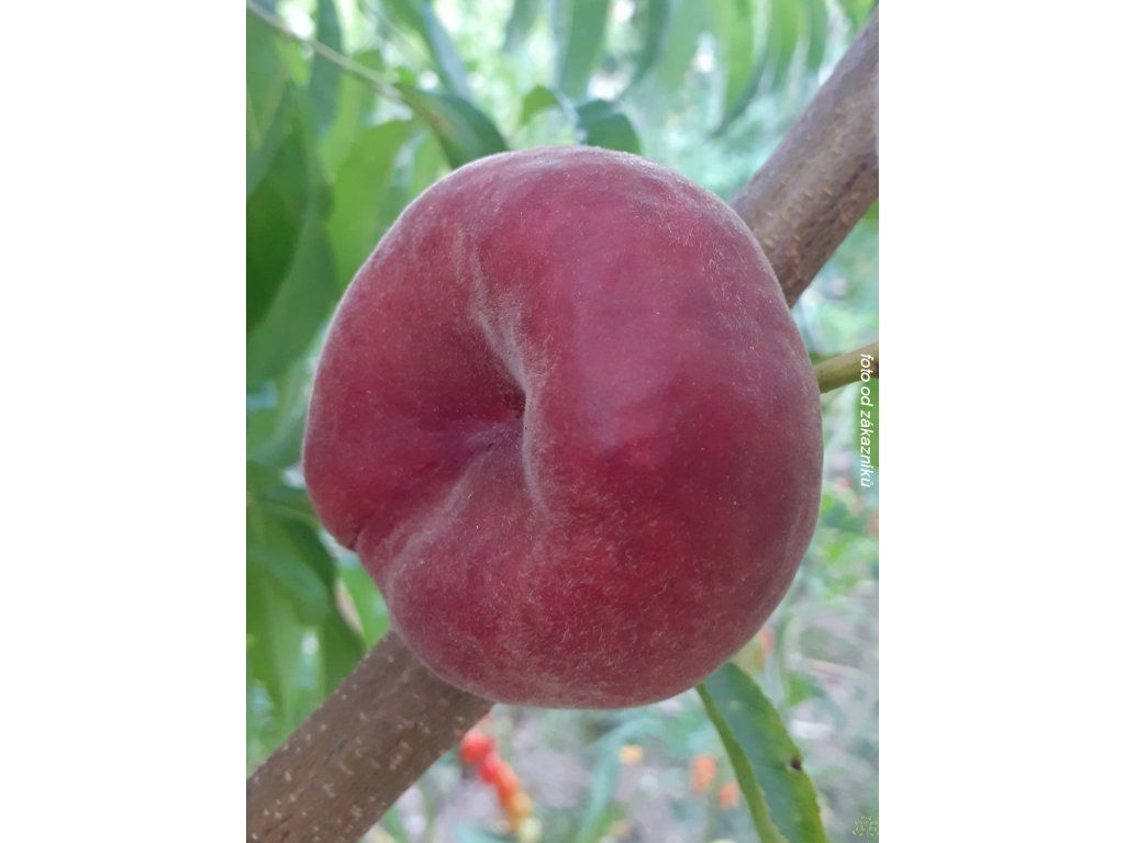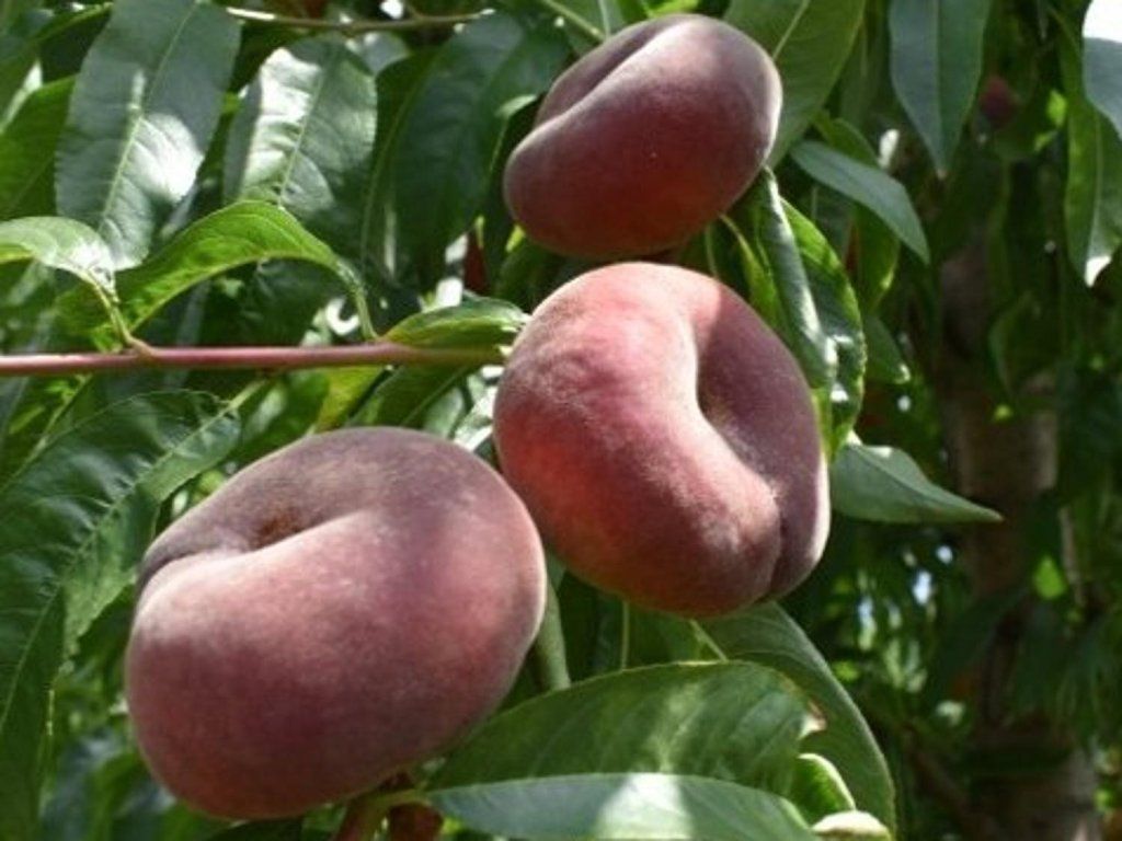 Pfirsichbaum ´Platybest´ - eine spätere Sorte mit flachen Früchten. Diese sind mittelgroß bis groß, deutlich abgeflacht. Die Oberfläche der Schale ist fast vollständig mit karminroter Farbe bedeckt. Das Fruchtfleisch ist cremeweiß, fest, mit einem sehr angenehmen, ausgewogenen Geschmack und haftet kaum am Kern. Die Früchte reifen ab der zweiten Augusthälfte, je nach klimatischen Bedingungen. Diese Sorte ist voll frostbeständig und resistent gegen Krankheiten.