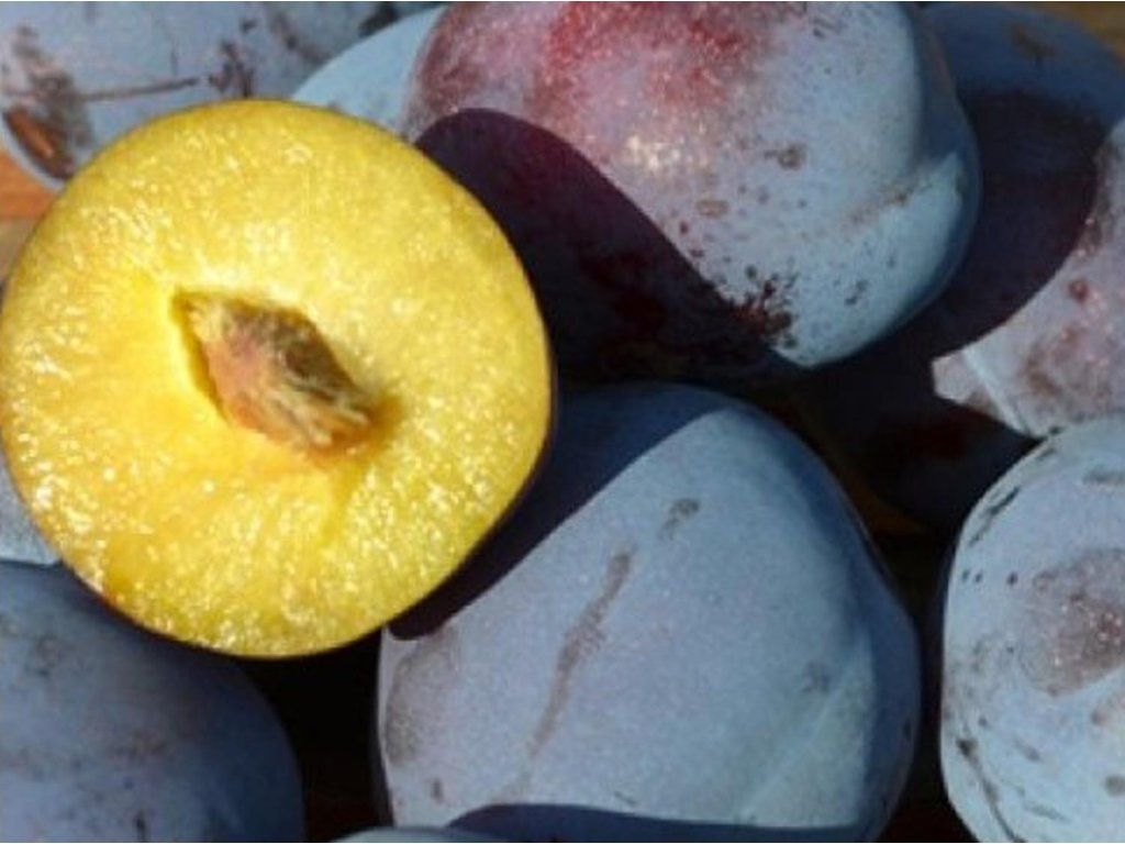 Pflaume 'Joganta' - neue, selbstfruchtbare Kreuzung, die aus den Sorten Jojo x Haganta entstand. Dieses sehr gelungene Exemplar ist resistent gegen Frost und alle Krankheiten. Die Fruchtbarkeit ist stabil und reichhaltig. Die Früchte reifen Mitte September. Die Früchte sind sehr groß, oval mit dunkelblauer Schale. Darunter verbirgt sich goldgelbes, saftiges Fruchtfleisch mit sehr süßem Geschmack. Es lässt sich leicht vom Stein lösen. Die Früchte eignen sich sowohl für den direkten Verzehr als auch für die Weiterverarbeitung.