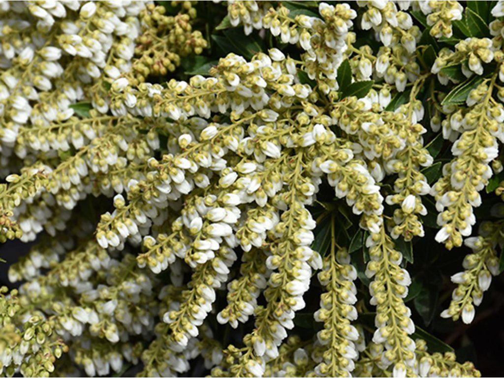 Pieris 'Prelude' - bildet einen kleineren, immergrünen Strauch, der bis zu 0,6 m hoch und 1 m breit wird. Ovalblätter haben eine dunkelgrüne Farbe, neue Triebe haben einen ausgeprägten kupferfarbenen Schimmer. Blüht im April bis Mai. Reichliche Büschel weißer Blüten, die in ihrer Form an Maiglöckchen erinnern, gehen rosafarbenen Knospen voraus. Die Pflanze ist auch sehr bienenfreundlich.