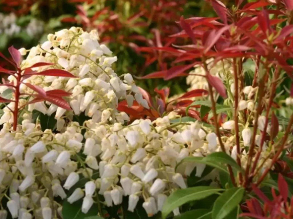Pieris ´Red Mill´ - ein mittelgroßer, immergrüner Strauch, der bis zu 100-180 cm in Höhe und Breite wächst. Der Strauch hat sehr interessante Blätter, die beim Austreiben rote Töne aufweisen, die sich allmählich in warme Brauntöne mit einem Hauch von Mahagoni verändern. Reife Blätter haben eine dunkelgrüne Farbe. Sie sind ledrig, schmal und spitz zulaufend und rollen sich leicht nach unten. Blüht mit weißen Blüten, und das schon im frühen Frühling, meist im März und April. Der Blütenstand ist in Rispen angeordnet, die elegant am Strauch hängen. Zusammen mit den Blättern ergibt sich eine sehr gelungene Farbkombination. Das Wachstum dieser Art ist langsam und somit für jeden Garten geeignet.