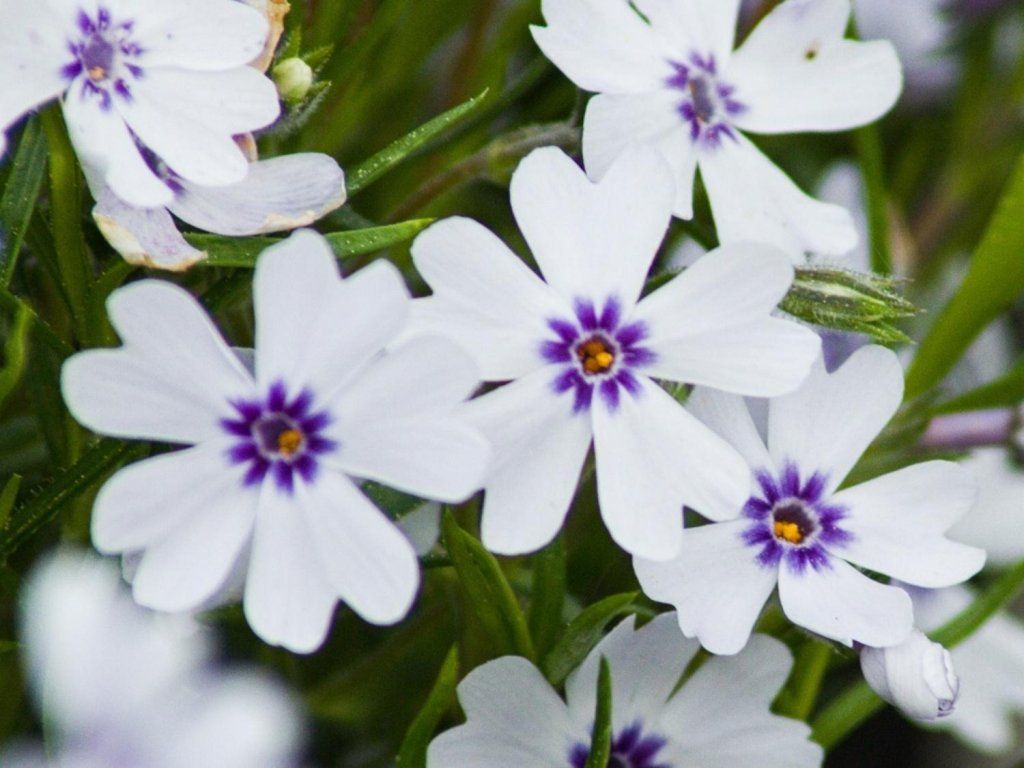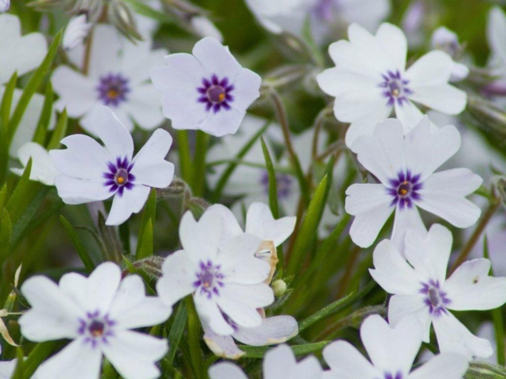 Phlox subulata 'Bavaria'mittel-schnell wachsende Bodendecker-Staude, die wunderschöne Teppiche bildet und eine Höhe von 5 - 15 cm und eine Breite von ca. 30 - 45 cm erreicht. Während April und Mai ist die Pflanze buchstäblich von einer Fülle von Blüten überschwemmt, die reinweiß mit auffälliger violetter Zeichnung in der Mitte sind. Die Blätter sind mittelgrün, linealisch und kurz. Sie eignet sich als Unterpflanzung für höhere Zierhölzer, für Steingärten oder auch für Behälter, aus denen sie einen schönen Überhang bildet.