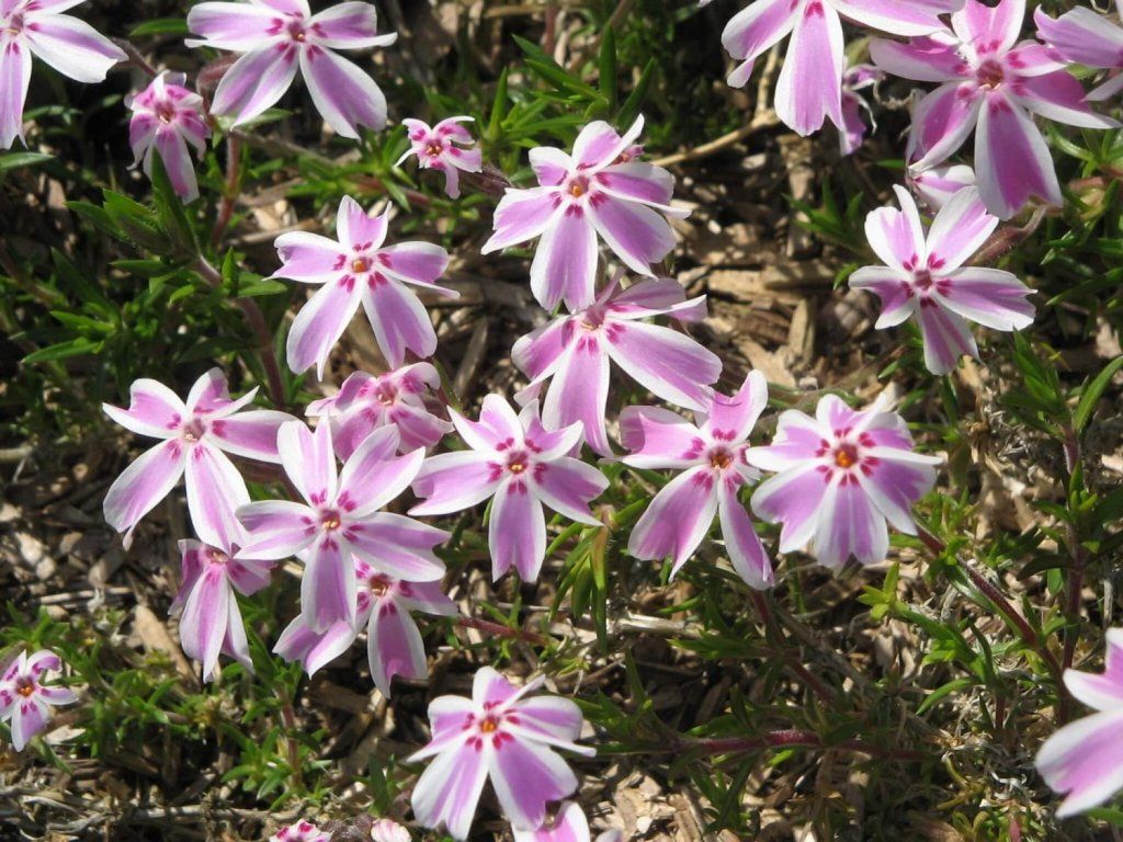 Phlox subulata 'Candy Striped' - eine bodendeckende Staude aus trockenen und steinigen Standorten im östlichen Nordamerika. Ihre kriechenden Triebe verzweigen sich dicht und wurzeln an den Knoten leicht an, sodass das Polster schnell den Boden bedeckt und ein niedriges Polster bildet. Die Sorte 'Candy Stripes' wird für ihre gestreifte Blütenzeichnung geschätzt, die auch auf größerer Fläche gut erkennbar sind. Die Pflanze erreicht normalerweise eine Höhe von 10–15 cm und eine Breite von 60–90 cm, bei guter Drainage auch mehr. Die Blätter sind pfriemenförmig, leicht steif, mittel- bis dunkelgrün und überwintern oft als niedriges, kompaktes Polster. Die Blütezeit ist meist im Mai und Juni. Das Wachstum ist mäßig schnell und im Laufe der Saison bildet sich oft eine geschlossene Fläche, die Unkraut unterdrückt und die Verdunstung reduziert. Die feine Blütenzeichnung ist auch in Pflanzungen an Terrassen und in Gärten beliebt, wo eine Nahbetrachtung erwünscht ist, z. B. in Kinderecken, da die Streifen gut erkennbar sind. Der Duft ist meist unauffällig, eher zart an warmen Tagen. Nach der Blüte bleibt das Polster eine niedrige grüne Linie, die die Ränder von Beeten optisch vereinheitlicht. Im Vergleich zu einfarbigen Sorten, wie z. B. der dunklen 'Atropurpurea', wirkt 'Candy Stripes' auch in kleineren Gruppen heller und dekorativer. Die Blüten sind sternförmig, ca. 2–3 cm groß, weiß mit einem deutlichen rosa Streifen und einem kleinen Auge, was einen regelmäßigen, fast grafischen Effekt erzeugt. Das Polster ist bienenfreundlich und zieht während der Frühlingsblüte Bestäuber in Steingärten und Kiesbeeten an. An Mauern und in Trögen hängen die Triebe über den Rand herab, an Hängen vereinheitlichen sie die Oberfläche und reduzieren die Erosion. In Kombinationen funktioniert sie gut mit Felsen-Steinkraut, Schleifenblumen, Gänsekresse, niedrigen Schwertlilien, Fetthennen und Hauswurzen, die gestreifte Blüte hebt auch einen einfachen Stein hervor.