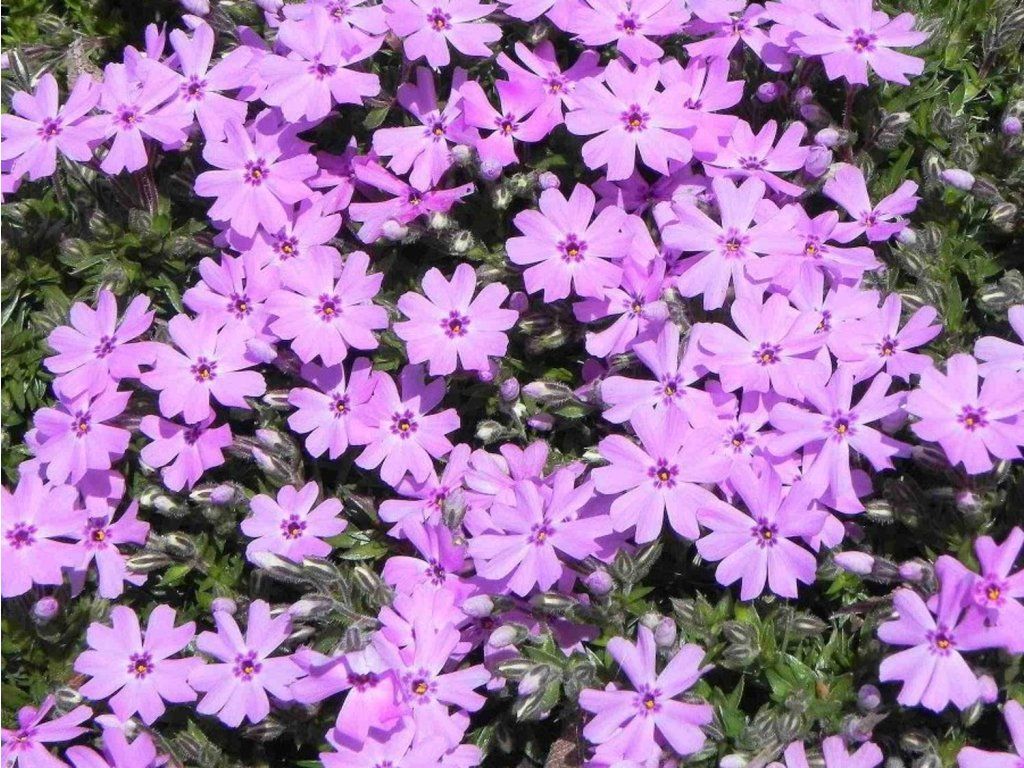 Phlox subulata 'Fort Hill' - eine Staude, die etwa 10 cm hoch wird. Die Blätter sind schmal, nadelartig und dunkelgrün. Die Pflanze bildet kompakte und dichte Polster, sie ist immergrün. Im April bis Mai blüht die Pflanze mit einer großen Anzahl von Blüten, die eine lila-rosa Farbe haben mit einem violetten Auge in der Mitte. Die Blüten haben die Form von Sternen. Sie blüht sehr reichlich.