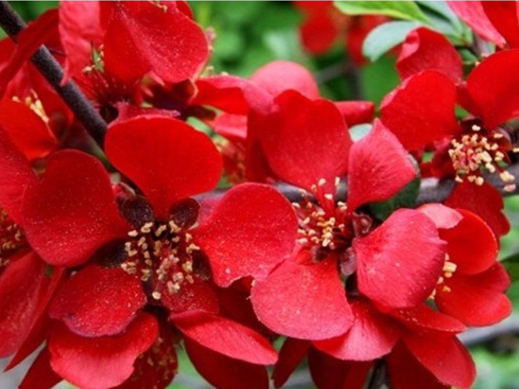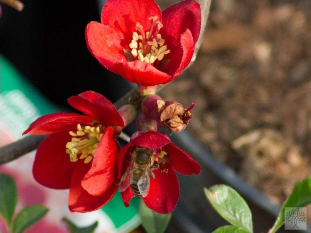 Zierquitte 'Crimson and Gold' - eine Gartenhybride, die von Arten aus Japan und China abstammt, wo Quitten natürlicherweise an buschigen Hängen, lichten Waldrändern und felsigen Berghängen wachsen. Sie bildet einen niedrigen, dicht verzweigten Strauch mit leicht dornigen Trieben, der etwa 0,8-1 m hoch und ähnlich breit wird. Sein Habitus ist von Natur aus kompakt und wirkt auch im blattlosen Zustand fest. Die Blätter erscheinen erst nach der Frühlingsblüte, sind eiförmig, mit glänzender Oberfläche und feiner Nervatur, etwa 3-5 cm lang. Während der Saison bleiben sie frischgrün und können im Herbst gelbliche Töne annehmen. Das auffälligste Merkmal dieser Sorte ist die frühe Blüte - die Blütenstände erscheinen im März und April, oft schon bei den ersten wärmeren Tagen, wenn die umliegende Vegetation noch schläft. Die Blüten mit einem Durchmesser von 3-4 cm sind tiefrot, mit fünf Blütenblättern und auffällig gelben Staubgefäßen, die einen feinen Farbkontrast bilden. Im Herbst folgen kleine, runde Früchte, gelbgrün bis gelb, fest und aromatisch. In der Küche werden sie wegen ihres hohen Säuregehalts und ihres starken Aromas für Sirupe, Gelees und aromatische Mischungen verwendet. Der Strauch macht sich gut in niedrigen Einfassungen entlang von Gehwegen, in Vorgärten, kleineren Beeten und gemischten Gehölzgruppen. Die leuchtend roten Frühlingsblüten bilden einen interessanten Kontrast zu früh austreibenden Gräsern, kleinen Frühlingszwiebelblumen oder Gehölzen mit dunklem oder weinrotem Laub.